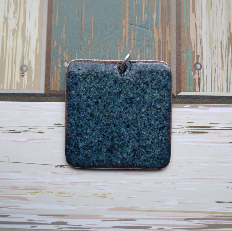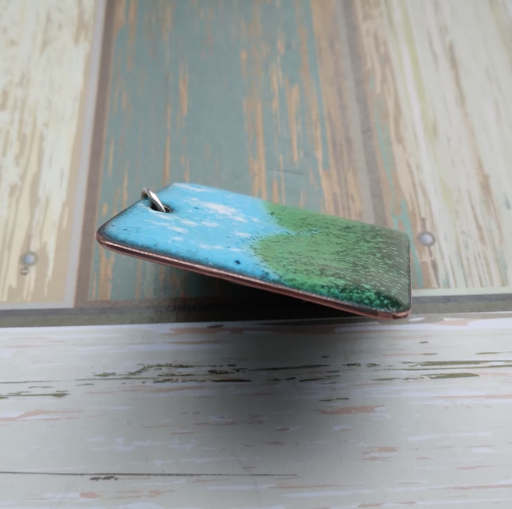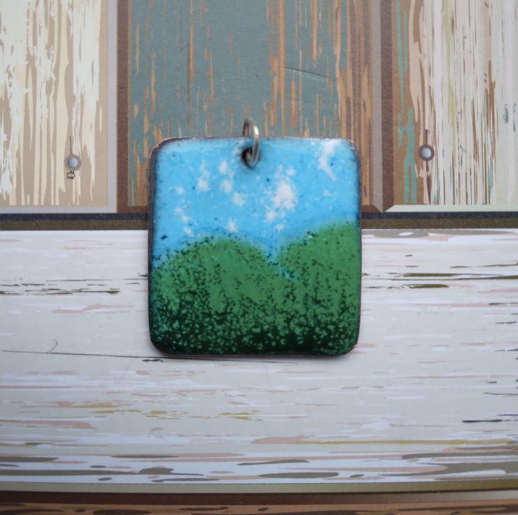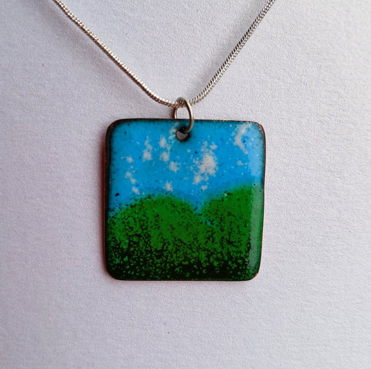 Square enamelled copper pendant with rounded edges with a scene of blue sky, green hills and darker green foliage. The pendant has been kiln-fired and measures approximately 27mm square. To complete the piece aesthetically and for a smooth finish against the skin, the back has been given two coats of dark blue tweed-effect enamel. It comes complete with a soldered sterling silver jump ring and is supplied with an 18" silver plated snake chain and a little organza pouch.