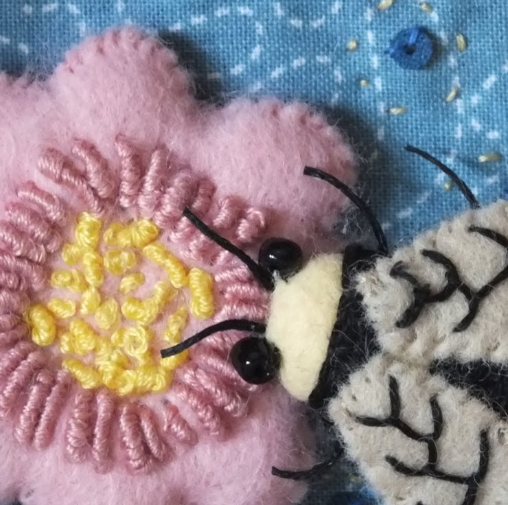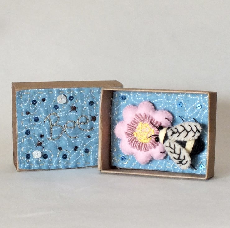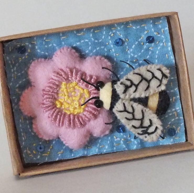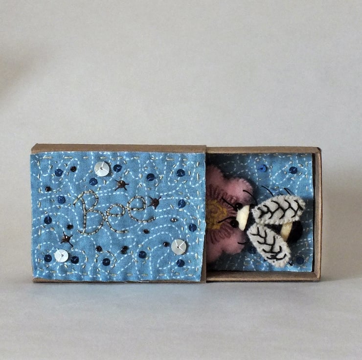 This is a large matchbox ( 9x7cms ) diorama with a wool felt embroidered flower with a felt and embroidery bee .The background fabric is cotton which has been stitched and trimmed with sequins and likewise the box lid has been stitched ,trimmed with blue sequins ,tiny seed beads metal sequins and mother of pearl buttons..