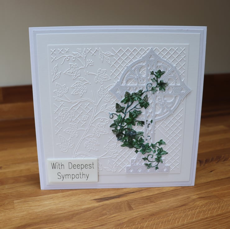 The cross is a silver pearl card with Ivy climbing around it, the sentiment is in black ink, With Deepest Sympathy, this card is blank inside for your personal sentiment.