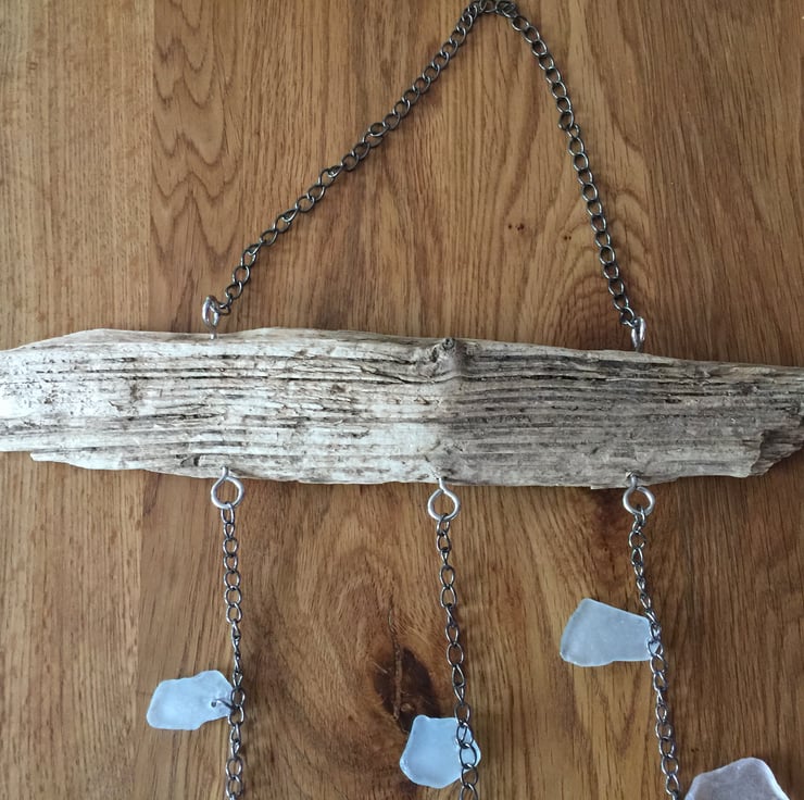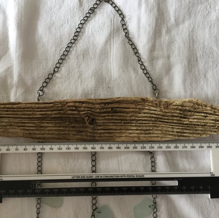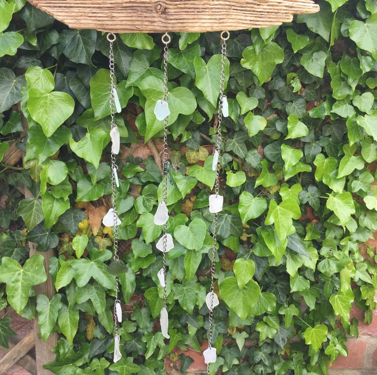 A driftwood and sea glass sun catcher to hang in your garden or against a window indoors. The driftwood was collected from the North Sea on a local beach and has been bleached at home. I collect the sea glass on regular dog walks on this beach. This sun catcher has three strands made of chain and a chain hanger. The strands are 40, 38 and 46 cm in length. The glass are different colours, shapes and sizes and so will reflect light in many different ways and each item will be unique in its effects, even if it follows a similar pattern. The length of the wood mount is 34cm. The prototype to this has been hanging in my son's garden in USA for some 8 months to now, experiencing temperatures below freezing up to 34 centigrade.