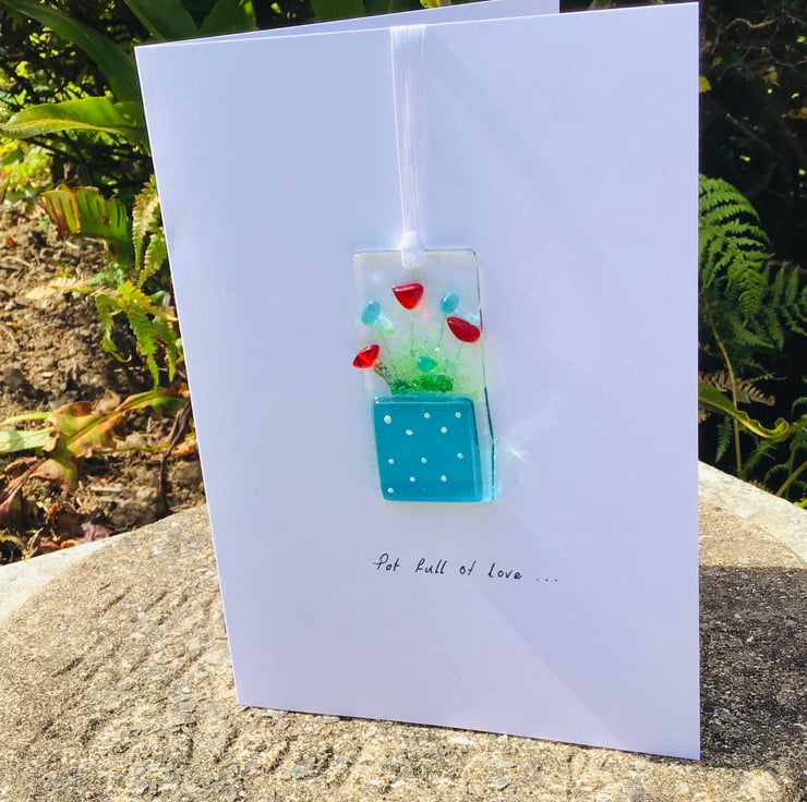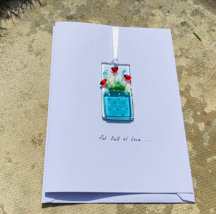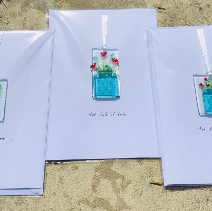 Any occasion card with detachable fused glass hanging decoration . These cards are unique and make a lovely card and gift in one .