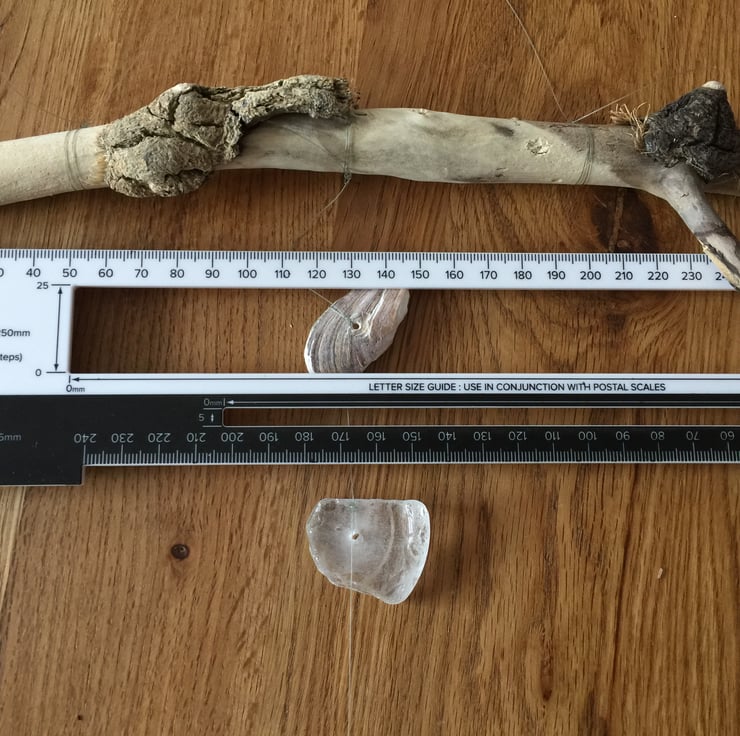 The wood mount is 26cm in length and the drop is 44 cm to bottom of last piece of glass. The way the pieces of glass and shell move and reflect light is unique to this piece since all sea glass is unique due to the action of the sea, sand and stones on it.