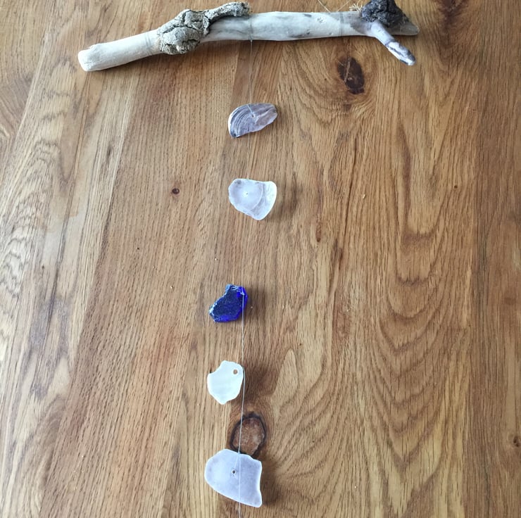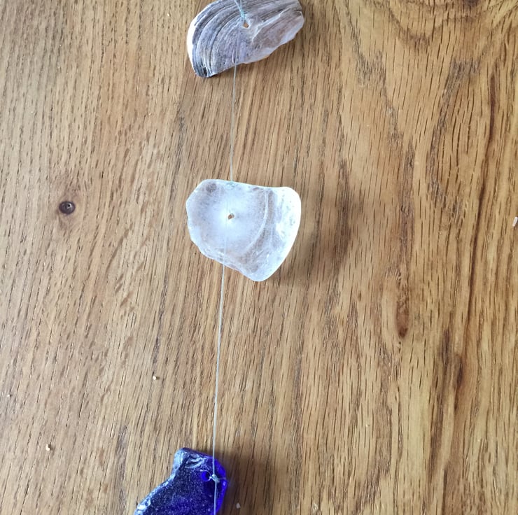 This unique suncatcher is made from a piece of driftwood and sea glass found washed up on my local beach. The piece of shell is from Easington beach. The driftwood has been bleached at home and the nylon fishing reel thread was unused and unwanted (except by me). So this piece is made completely from unwanted materials.