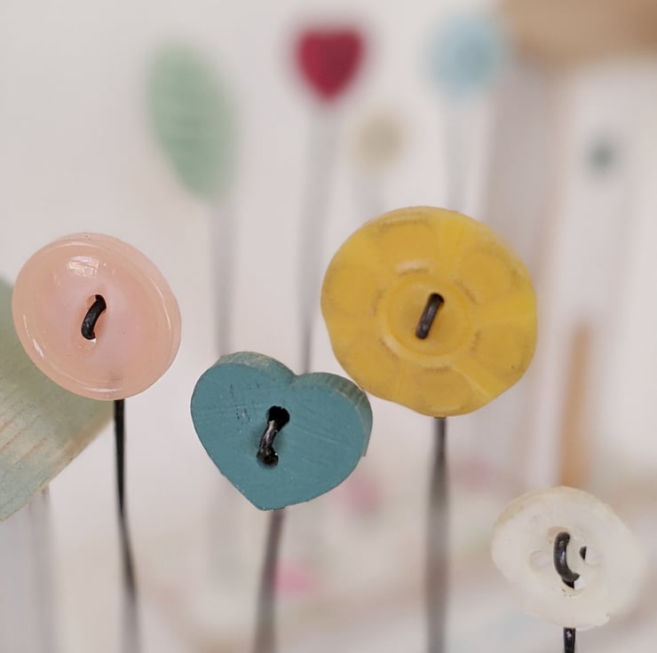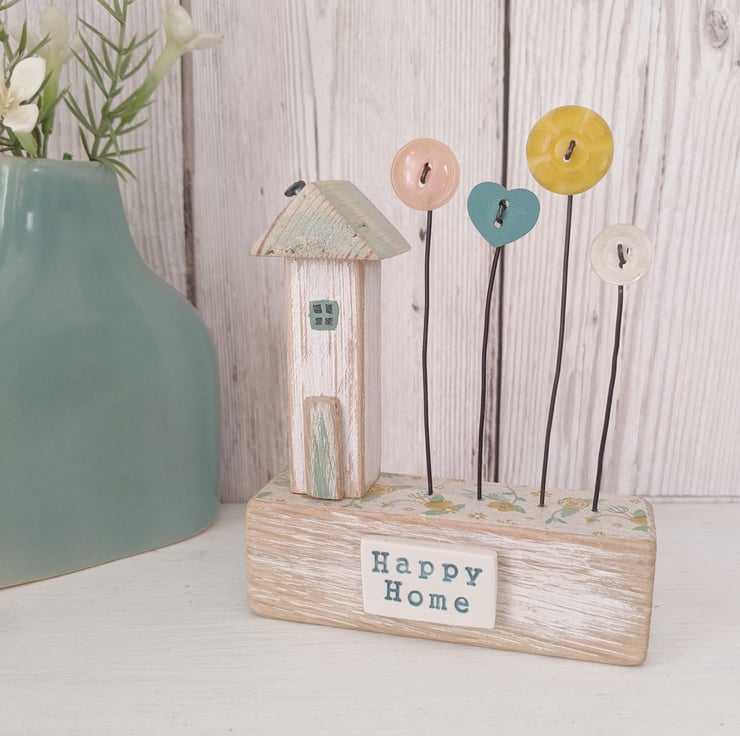 This little hand-painted oak wood home has a painted door and a garden of button flowers.