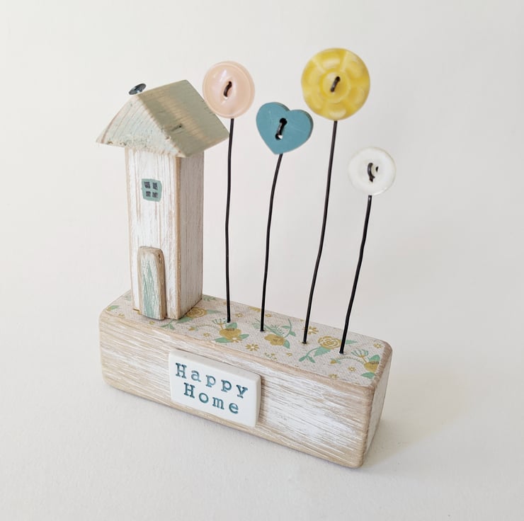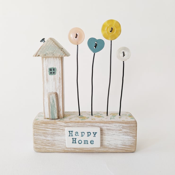 It sits on a painted and decoupaged wood block and on the front there are the hand stamped words 'Happy Home'.