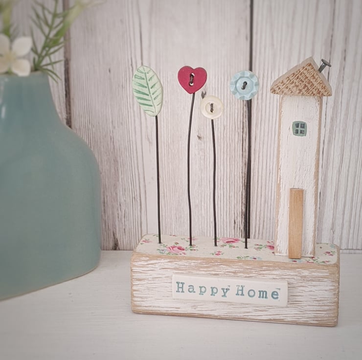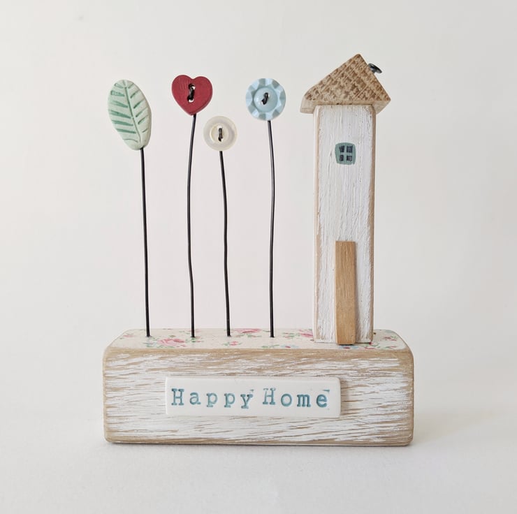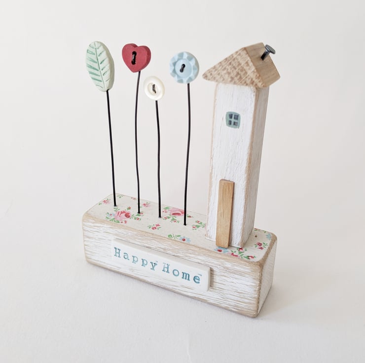It sits on a painted and decoupaged wood block and on the front there are the hand stamped words 'Happy Home'.