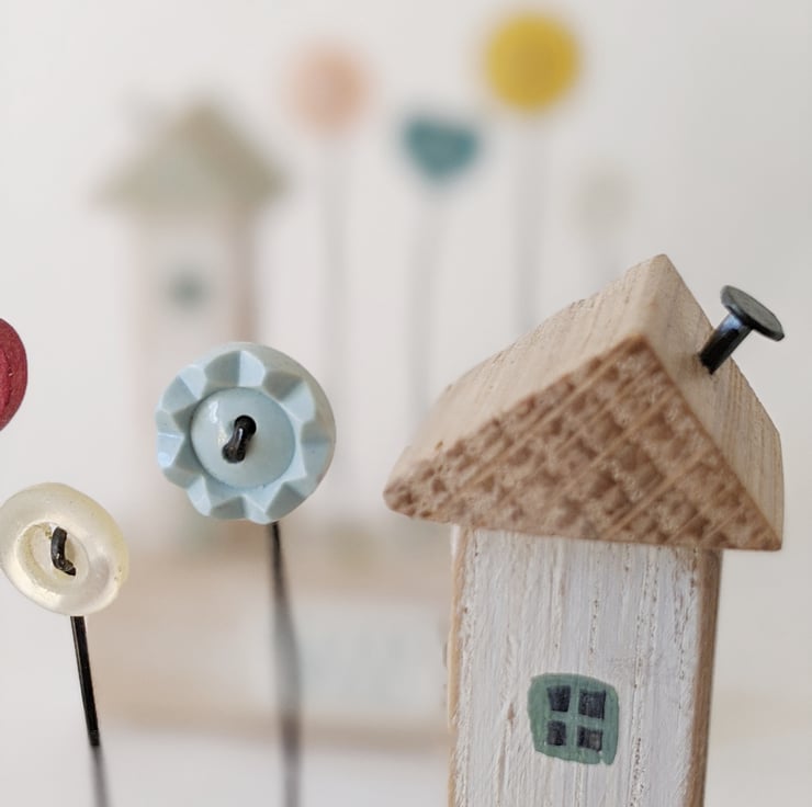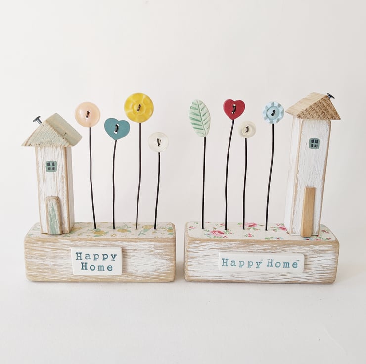 This little hand-painted happy home has a wooden door and a garden of button flowers.