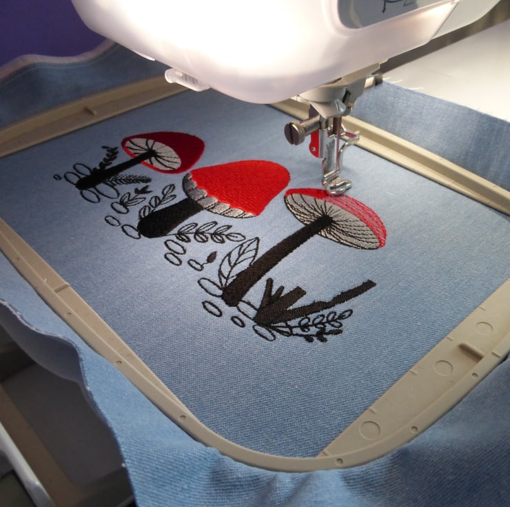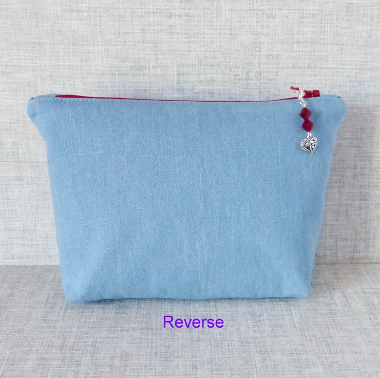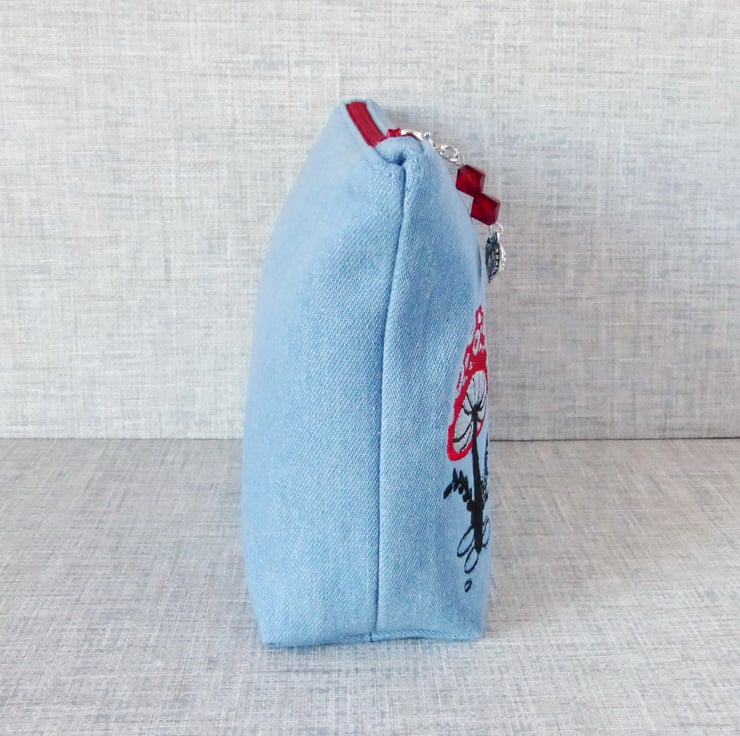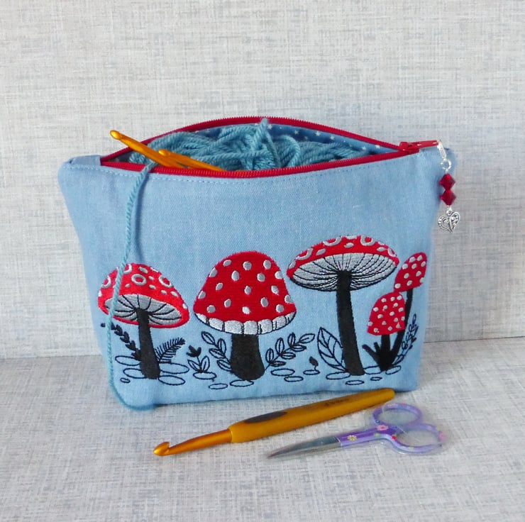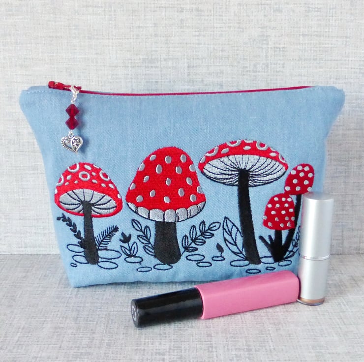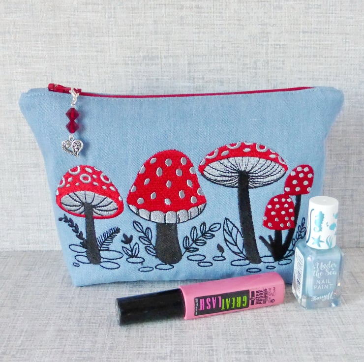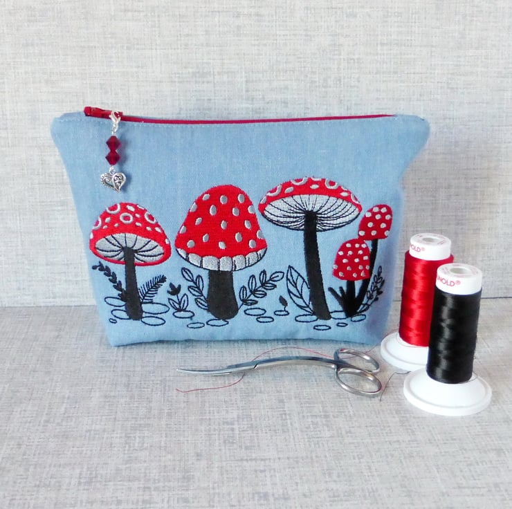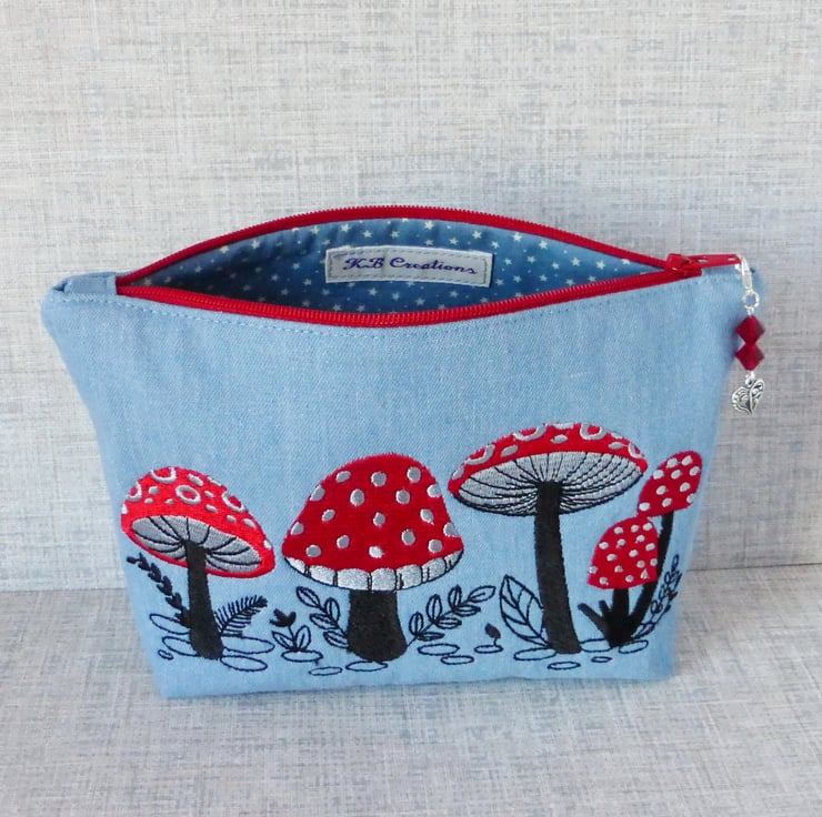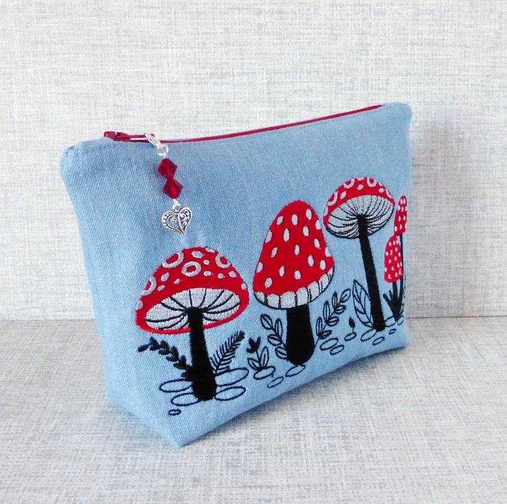 A large sized zipped pouch, made from a light coloured denim fabric and embroidered with toadstools in red, silver grey and black...