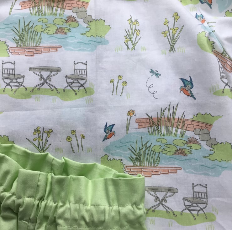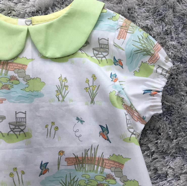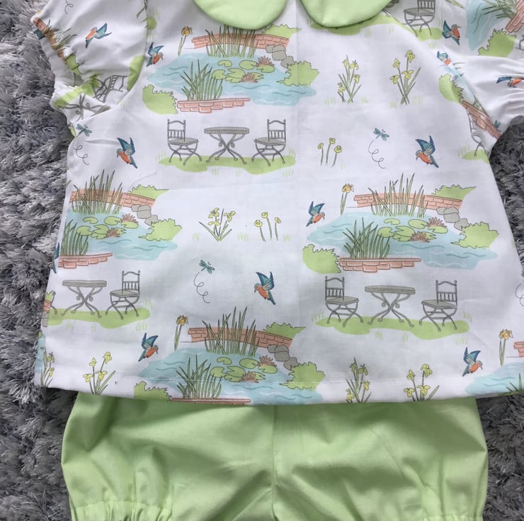 beautiful little girls top and matching bloomers. I have made this top in a soft cotton fabric with a summer garden scene. This has little butterflies and birds. The blouse buttons at the back and is finished off with a pastel green Peter Pan collar. The bloomers are in the same pastel green and f8 I shed off with a white bow.