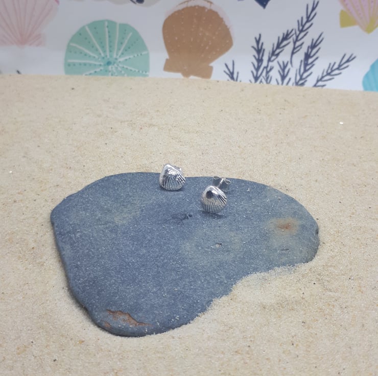 Approximately 0.8cm tall fine silver cockle shells with sterling silver posts & scrolls.