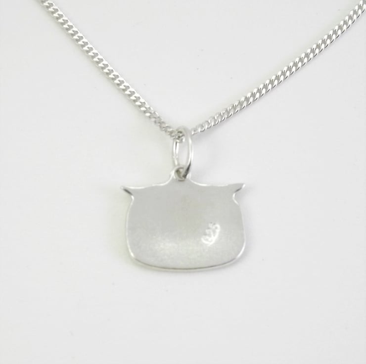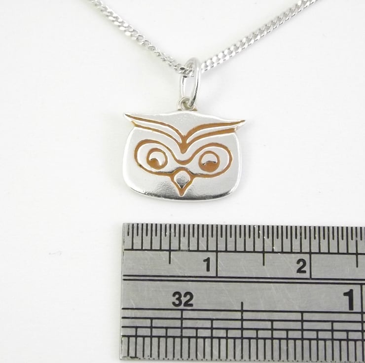This small owl pendant has been crafted from recycled sterling silver sheet and is etched before being cut by hand, the edges are then smoothed using files and emery paper before it's carefully given its shape using a punch and hammer. A 5mm oval jump ring is then attached. A brown resin based enamel is added to the etched areas and the piece is then polished before being attached to a chain.