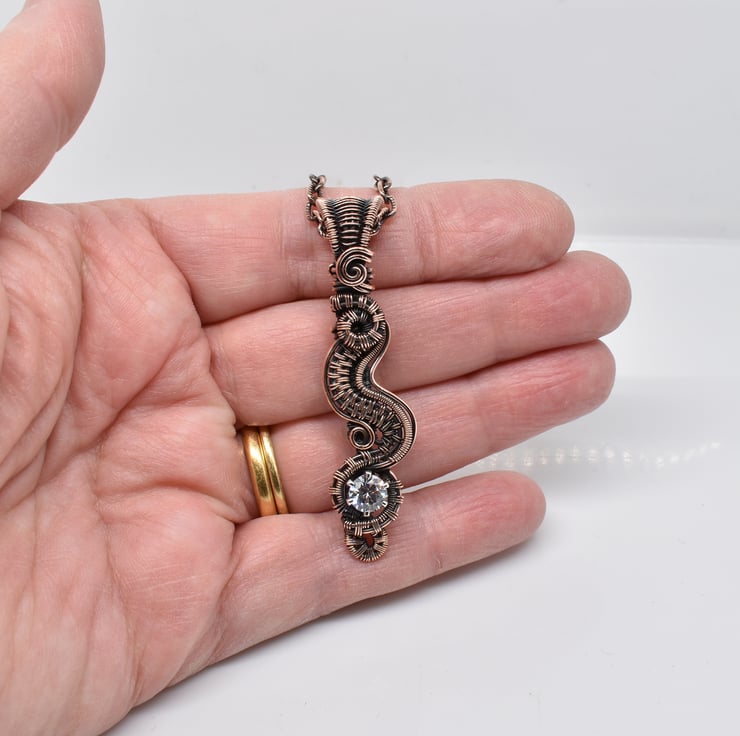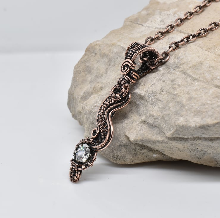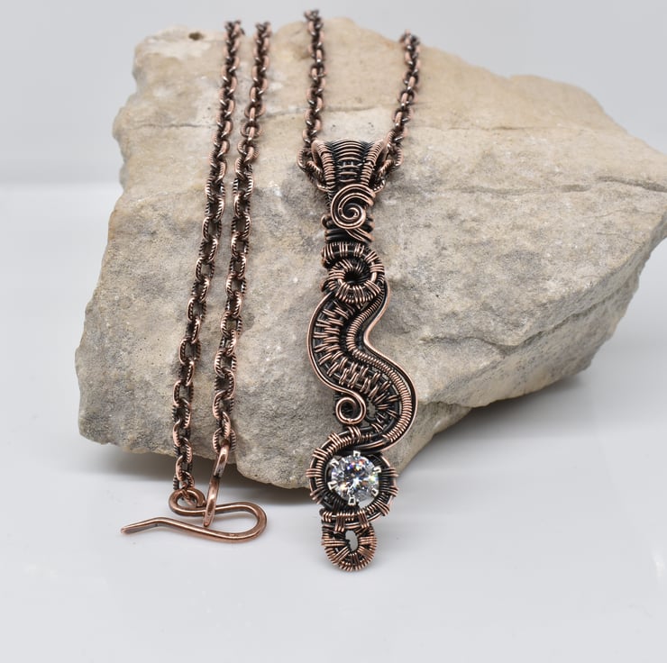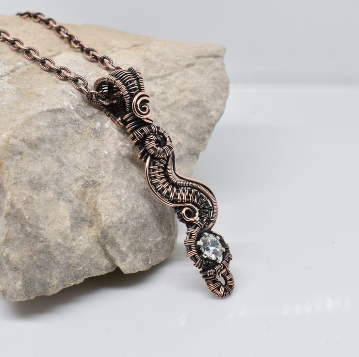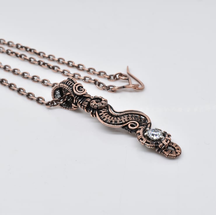 I have hand woven this striking pendant using solid copper wire around a 6mm cubic zirconia in a sterling silver setting to make this pretty pendant which hangs from a copper chain with handmade clasp.