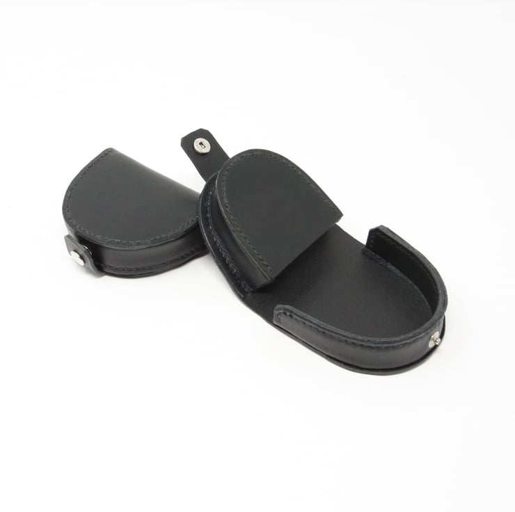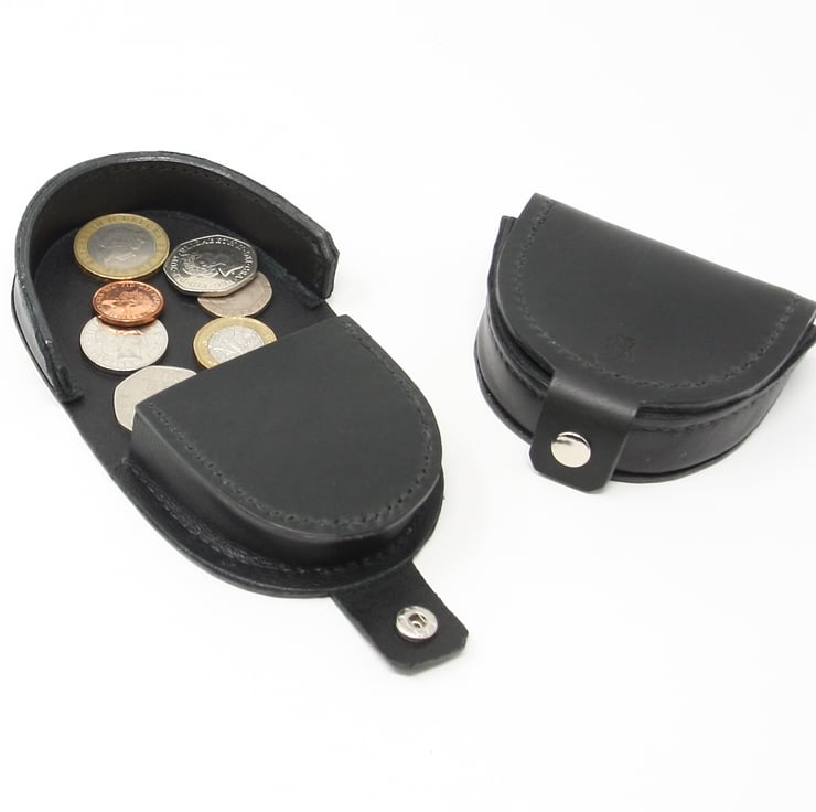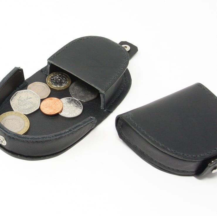 Black leather coin purse made from Italian distressed black veg-tanned leather with a thinner black upholstery leather in the gussets. It is all completely hand-stitched using traditional saddle stitch on all the seams. It consists of a pocket for the coins, and when opened, a tray to keep the coins safe while you search for the right change. The purse closes with a press stud to ensure it stays closed when in a bag or pocket.