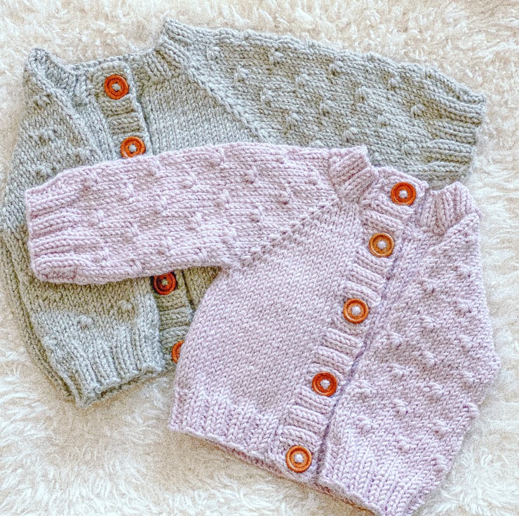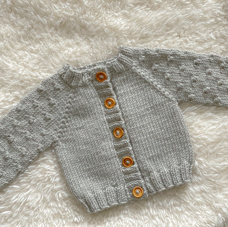 Made from merino wool and hand knitted, this is a cosy and soft baby cardigan to fit a baby up to three months.