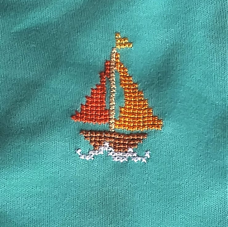 This is part of a new venture - hand-embroidering T-shirts with long sleeves. The bright colours of the boat contrast well with the turquoise shirt.