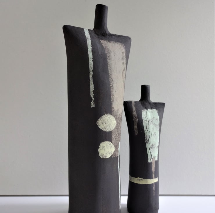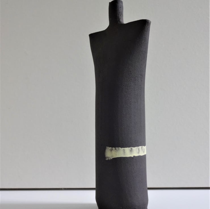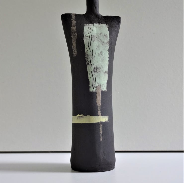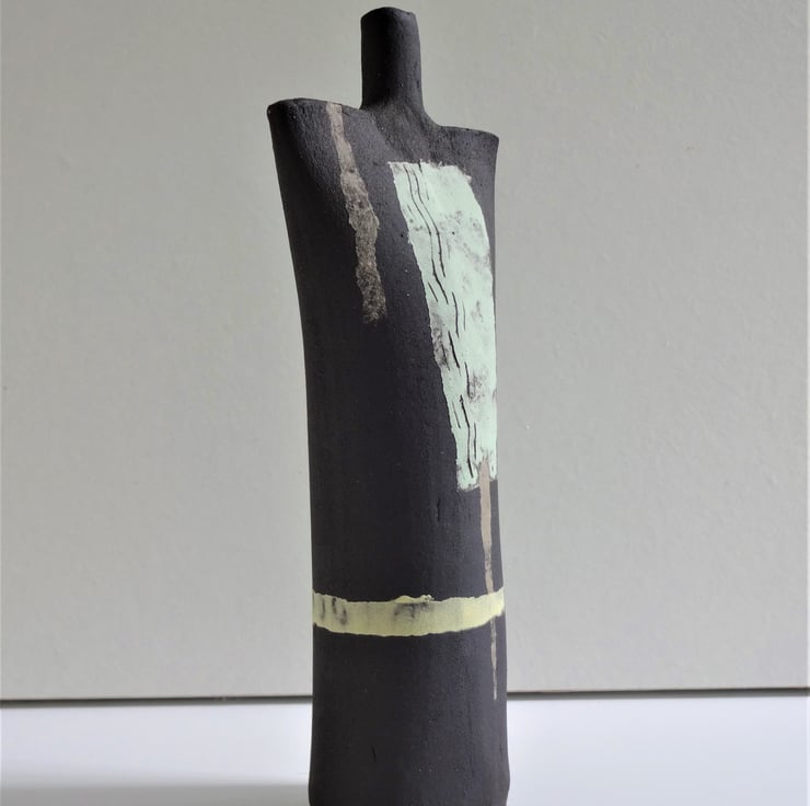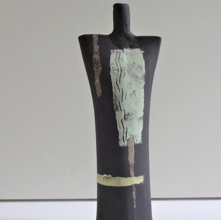 Esther is from the Kindred Collection, a family of handmade black stoneware pieces, each one with its own distinctive shape, decoration and personality. I created Esther’s motif in shades of lemon, pale turquoise and earth tones, applied with a natural sponge, and added further carved sgraffito marking. Esther works well as a stand alone piece, or as part of a group with others from the collection – as seen in the images. The simple figurative form and abstract decoration can make a contemplative focal point for yoga/mindfulness meditation. On the base you’ll find my potter's mark of a swallow in flight. Esther is 17cms high.
