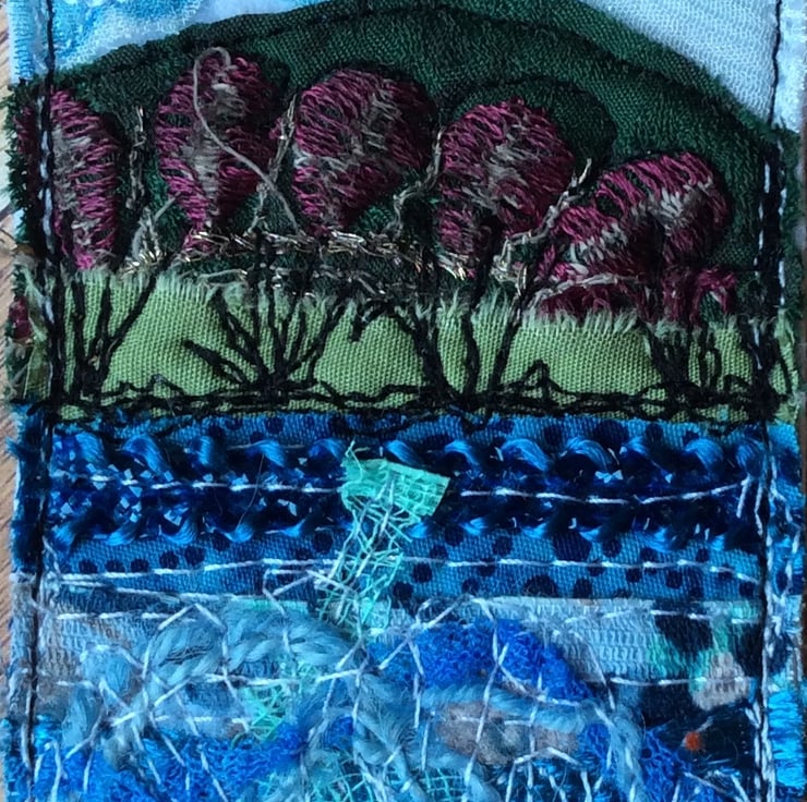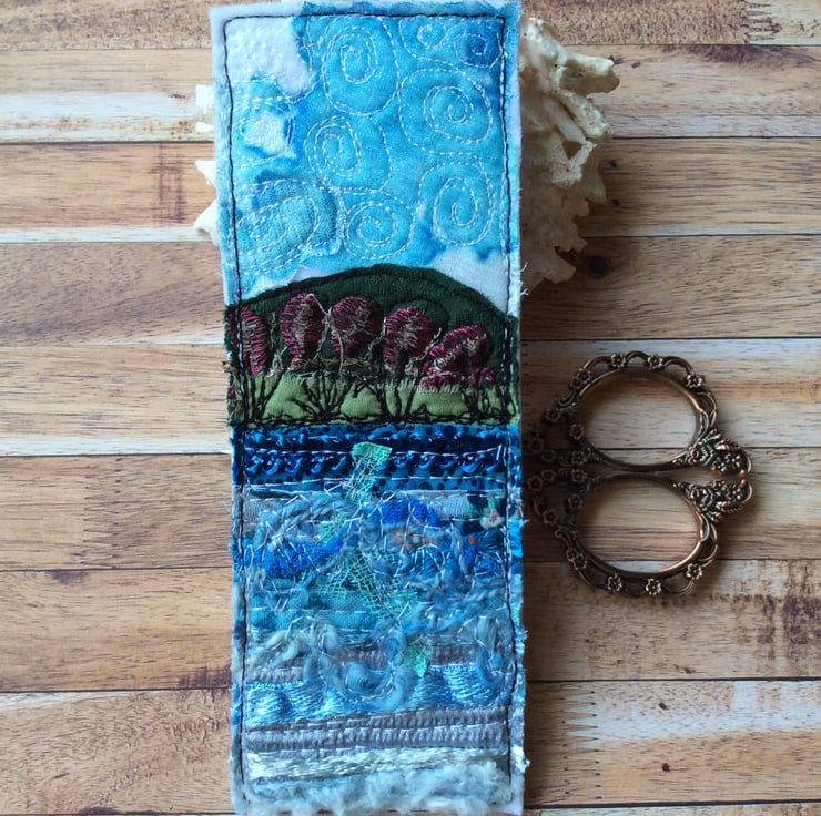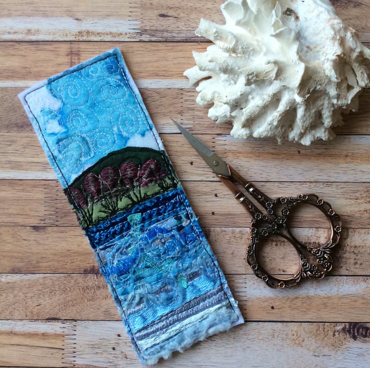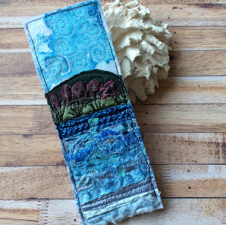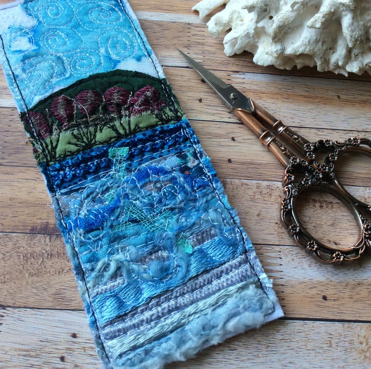 This embroidered seascape bookmark is made with layered up cycled and recycled fabric and ribbon, and enhanced with wool and free motion embroidery. The bookmark measures 5.5 x 16cm.