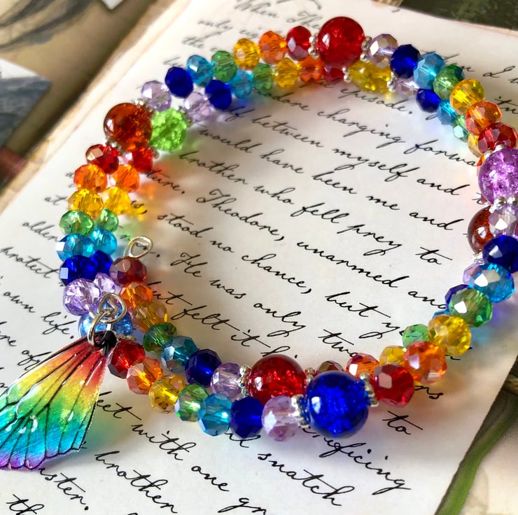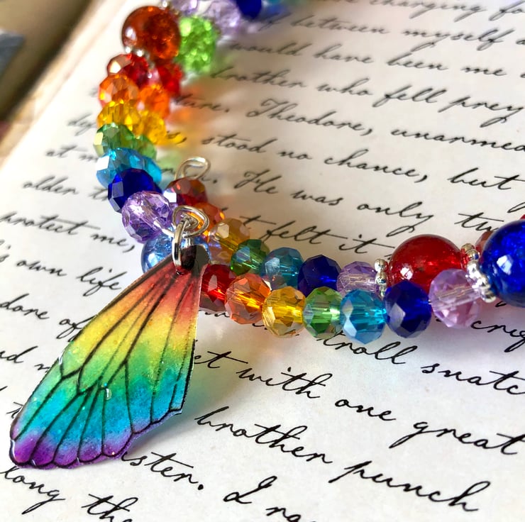 I have added brightly coloured glass crackle beads in lots of rainbow colours. I have also added some beautiful Czech glass beads, silver spacers and a dainty rainbow fairy wing that has been glazed. Tiny little pieces of iridescent glitter sparkle beneath the wings shiny surface to add that extra touch of magic.