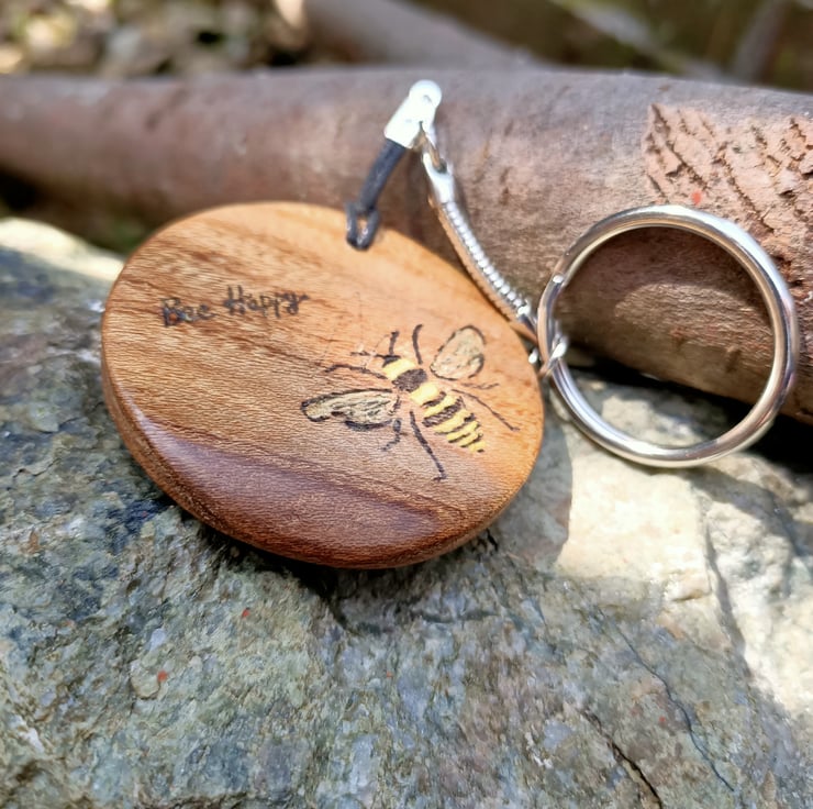 Love nature? this wooden keyring has been handcrafted from solid Scottish elm wood. It has been hand turned, sanded and polished. We have designed a lovely busy bee with hand pyrography and coloured resin. Bee Happy has been added using the pyrography technique. It has a black cotton thong and silver coloured keyring. It is for those who love nature and conservation. We adore our friendly bugs and bees and look after them with our range of bug houses and bird feeders.