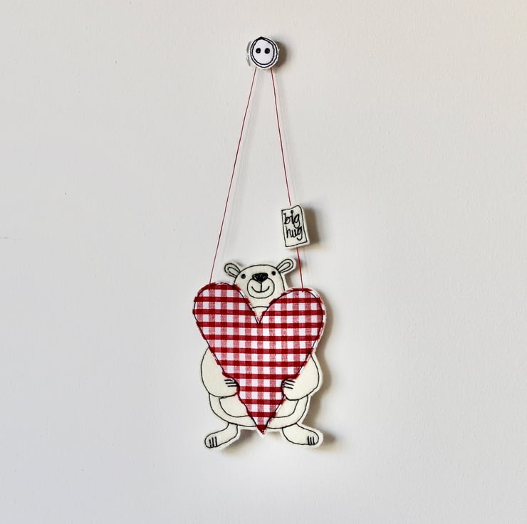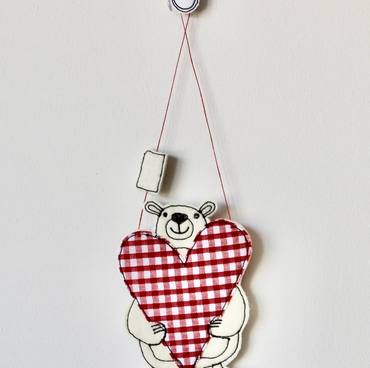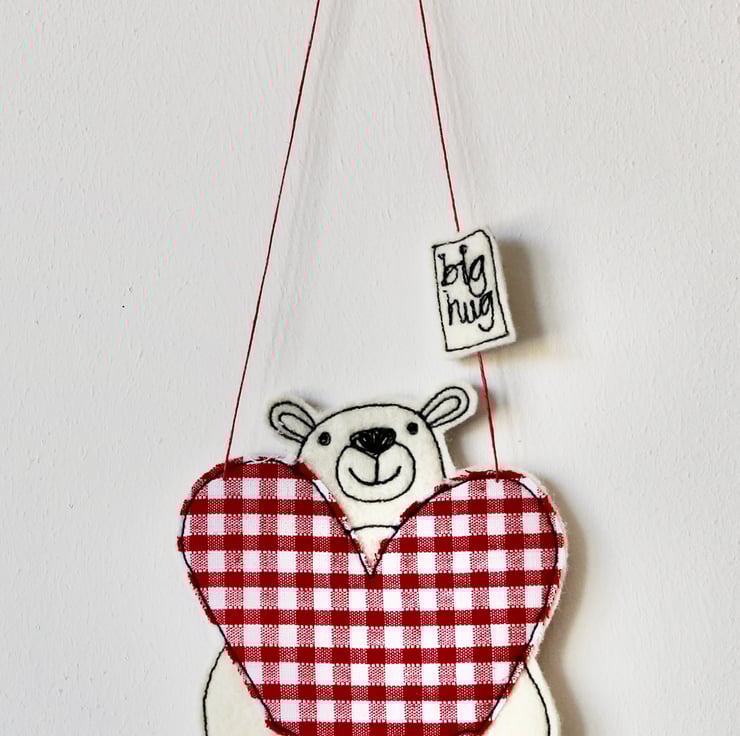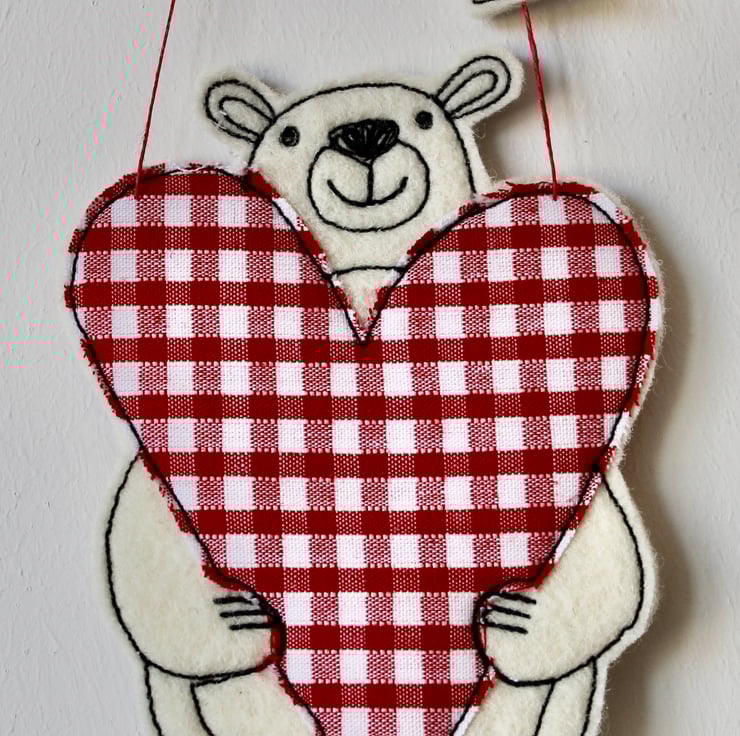 Mr Bear is created using free hand machine embroidery, 100% wool felt, gingham cloth, and red linen string to hang. Multiple layers of cloth are sewn together and cut out by hand, using a very sharp pair of scissors.