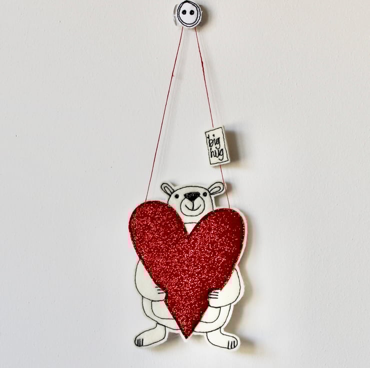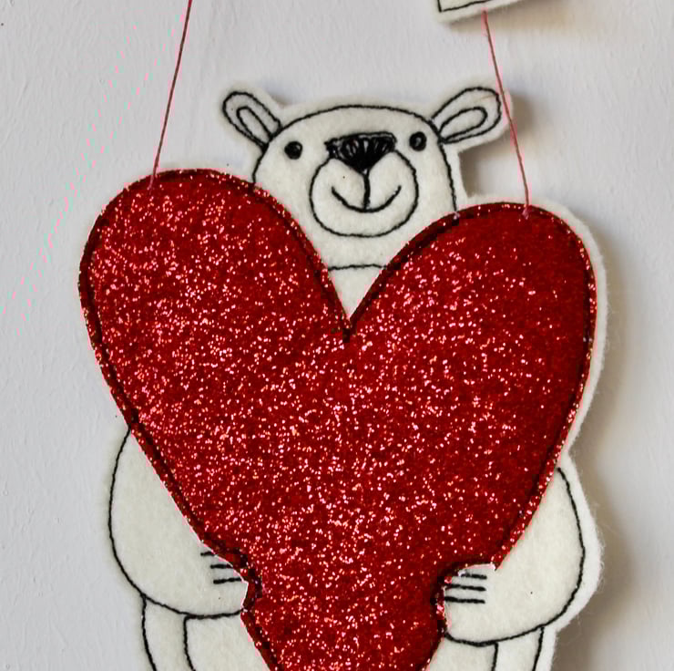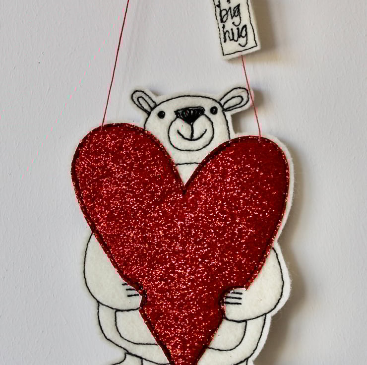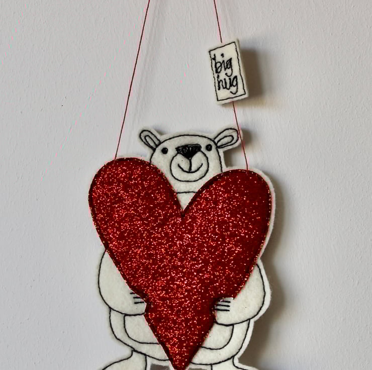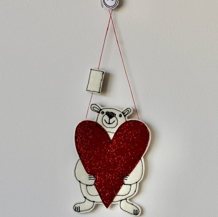 Mr Bear is created using free hand machine embroidery, 100% wool felt, glitter fabric, and red linen string to hang. Multiple layers of cloth are sewn together and cut out by hand, using a very sharp pair of scissors.
