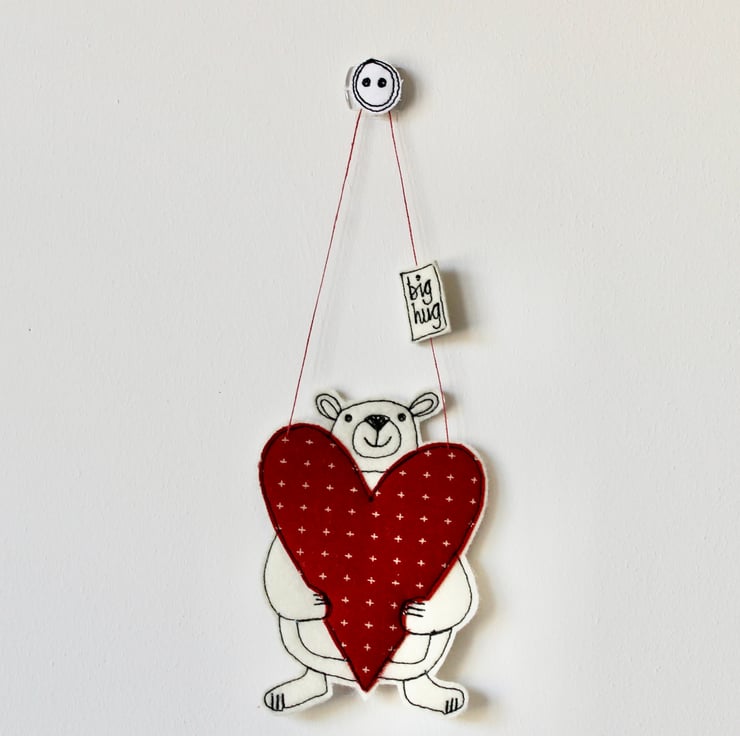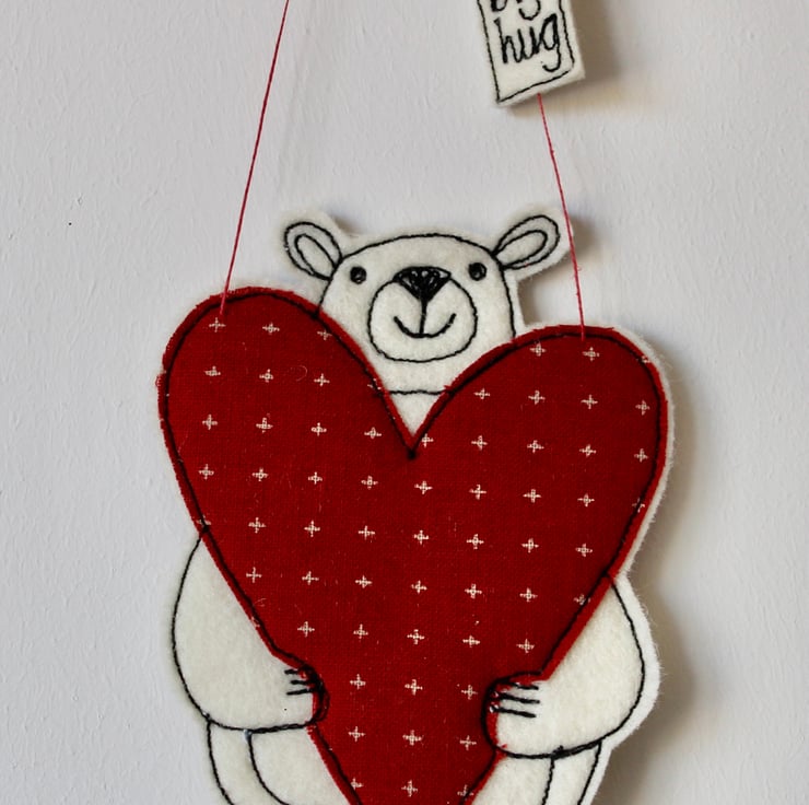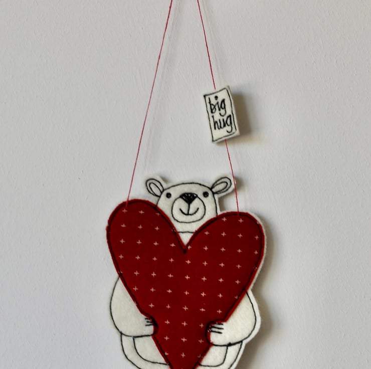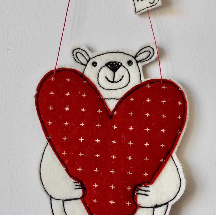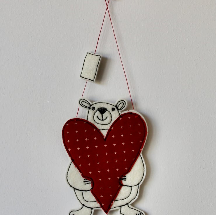 Mr Bear is created using free hand machine embroidery, 100% wool felt, cotton cloth printed with crosses (or kisses as I think of them) and red linen string to hang. Multiple layers of cloth are sewn together and cut out by hand, using a very sharp pair of scissors.