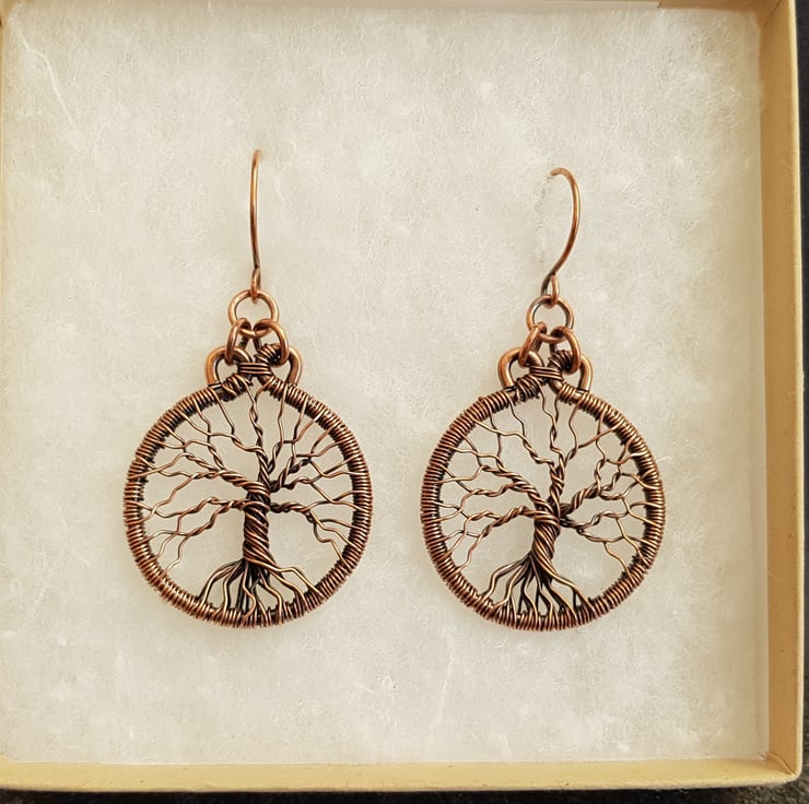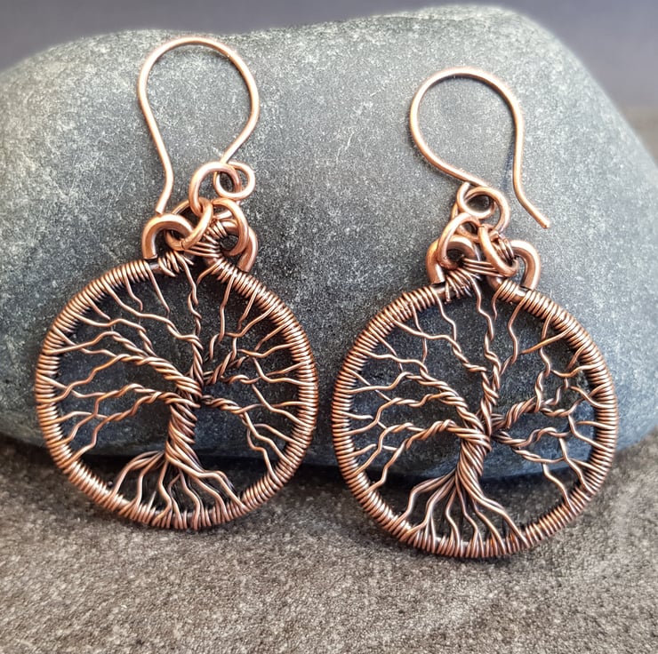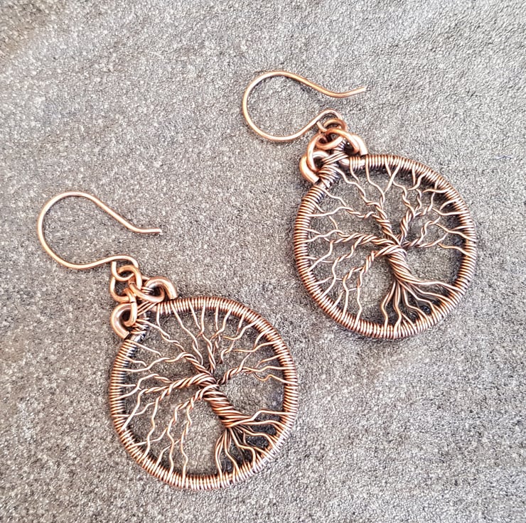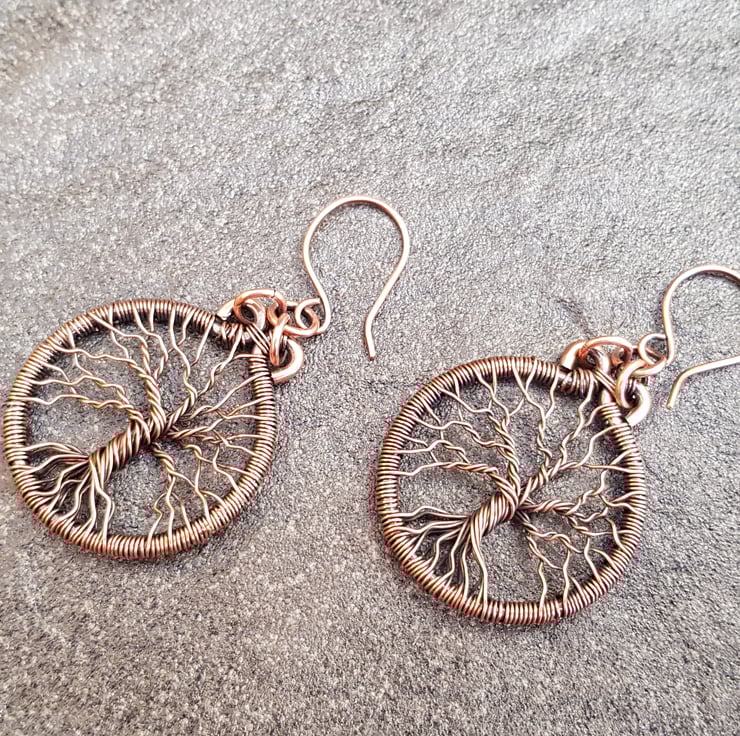 I have wire wrapped these tree of life earrings using solid copper wire and they hang from matching handmade ear wires.