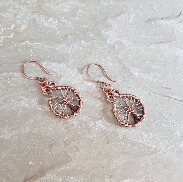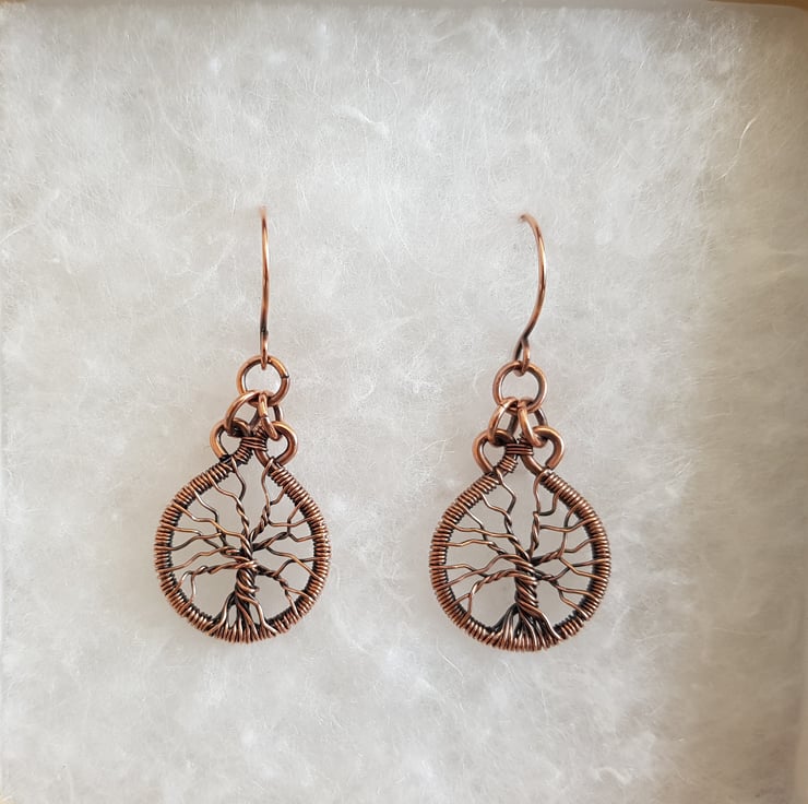 I have wire wrapped these dainty tree of life earrings using solid copper wire and they hang from matching handmade ear wires. I added a patina to age the copper, then hand polished them to a lovely antique copper finish.