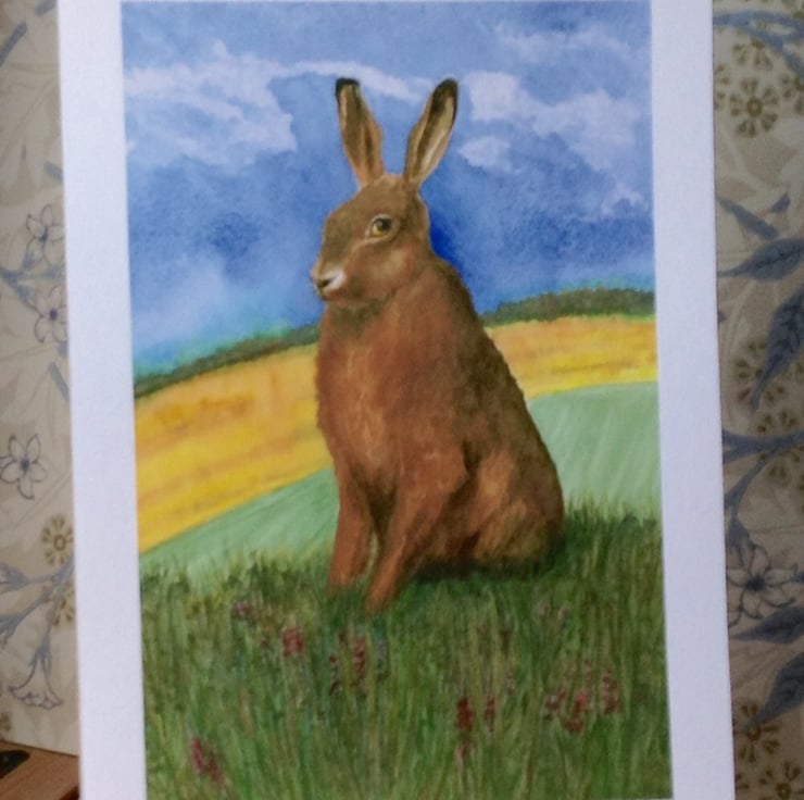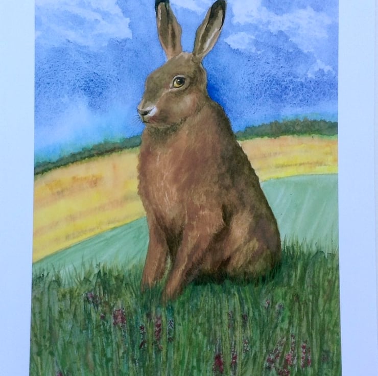 Quality giclee print on archival paper of my original watercolour, featuring a hare sitting in a summer landscape.