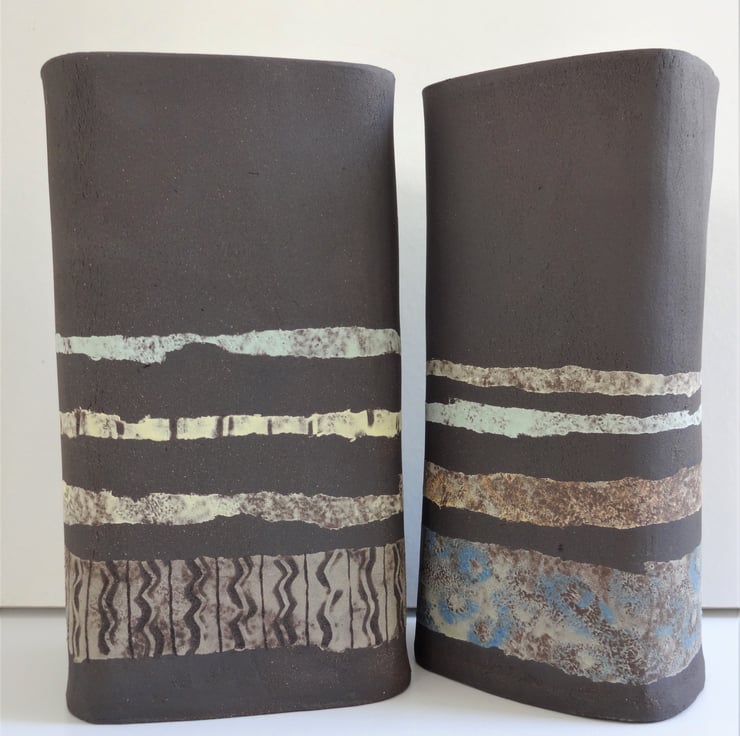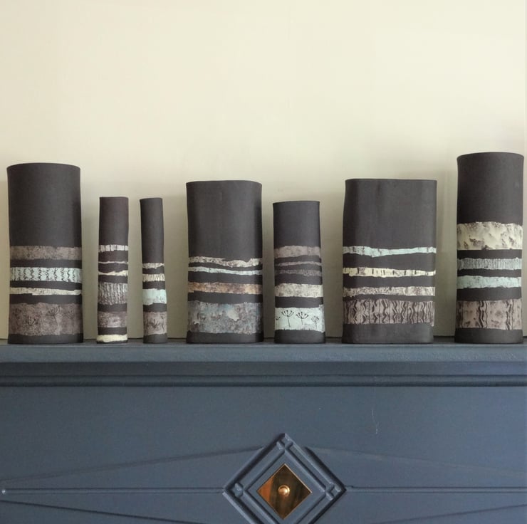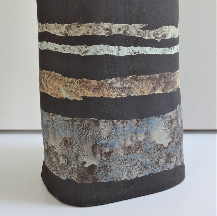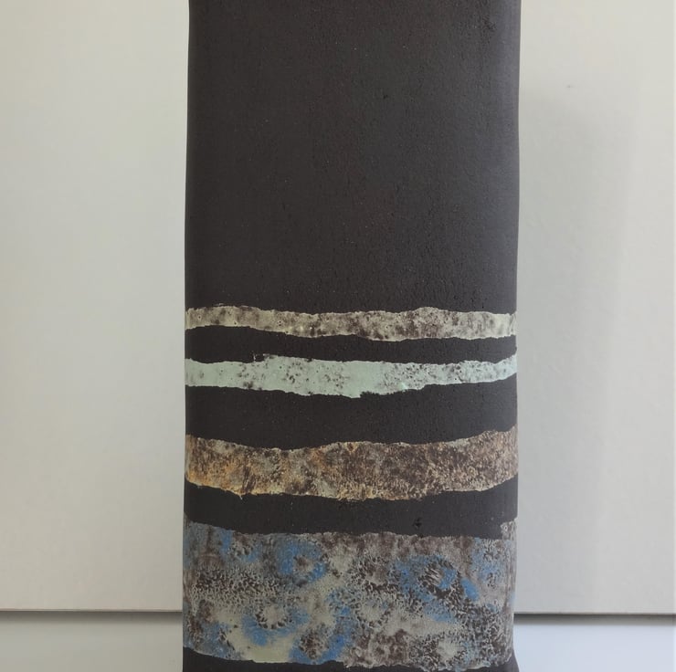 Ewen is part of the Simple Earth Collection, handmade in black stoneware clay and decorated with abstract bands of colour. He looks good on his own, as a focal point on a shelf, mantelpiece or storage unit, or can be used to display your favourite blooms, twigs or blossoms. Ewen also looks impressive as part of a group with other pieces from the Simple Earth Collection, as you can see in the images. He stands approx 17.5 cms tall and is a soft rectangular shape 2.5cms x 5cms at the base. I use soft pastel shades for the decoration, applying colour with a natural sponge. The interior is glazed, but I like to leave the exterior surface unglazed with the matt black finish of the natural clay.