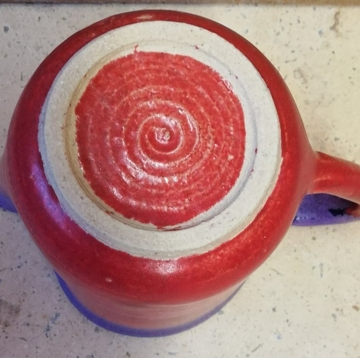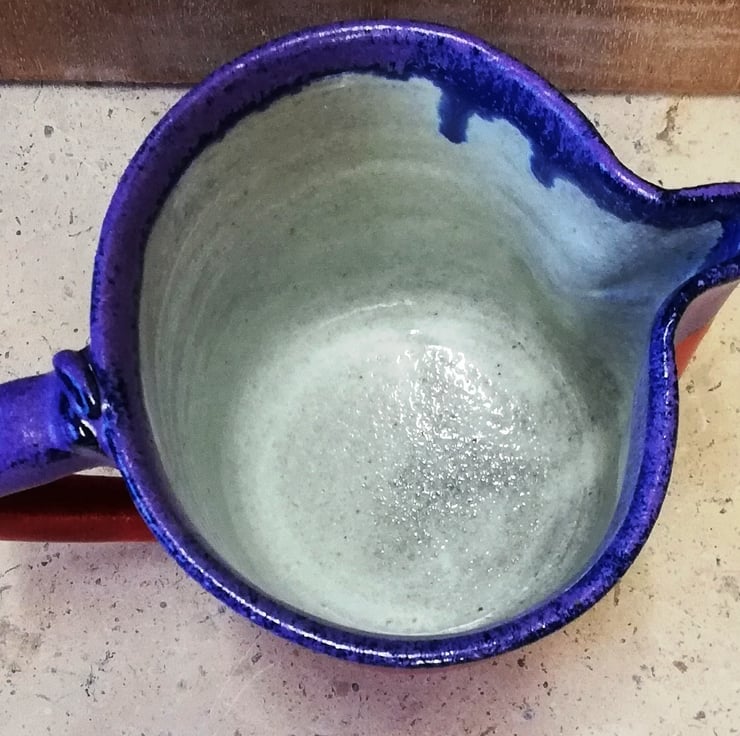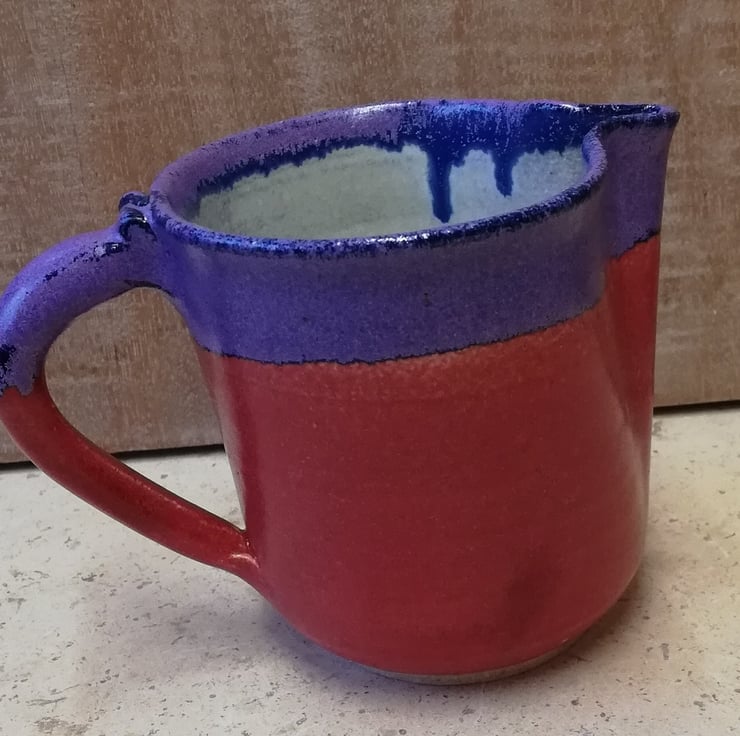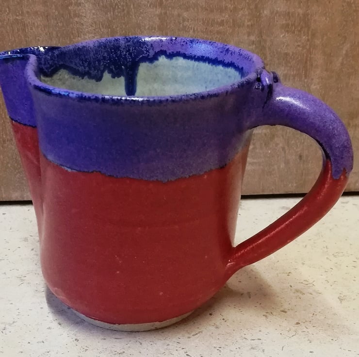 A tactile ceramic jug in semi-gloss red and purple rim, eggshell white inside for easy cleaning.