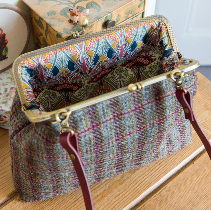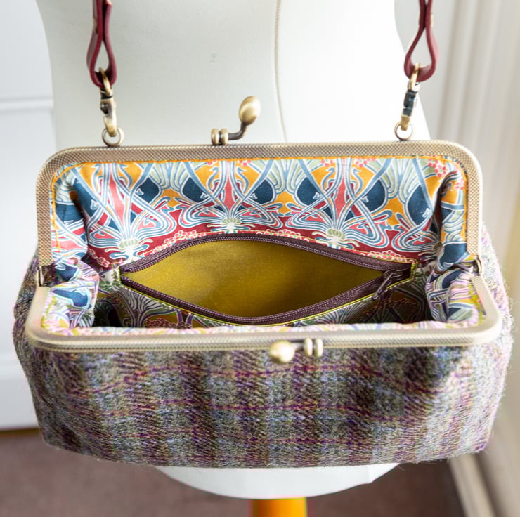 The lining is made with Liberty Tana Lawn in a beautifully colourful Art Noveau style print, which I've also interfaced for longevity. I've added a zip pocket to one side of the lining in a golden shot silk and stitched the bag to the kiss frame with perle cotton. The finishing touch is a slim deep red leather shoulder strap, long enough to fit comfortably on your shoulder or over your arm.