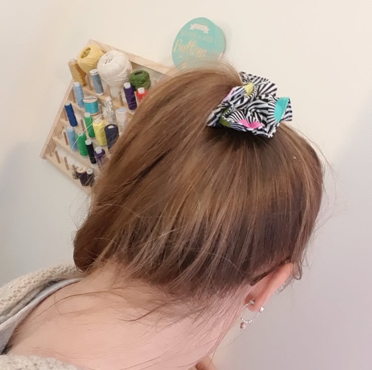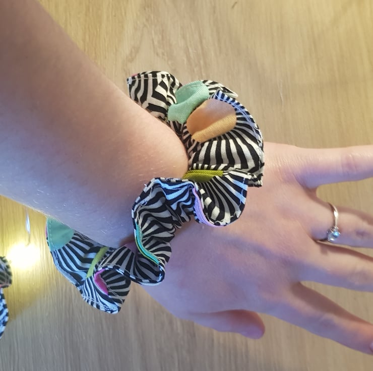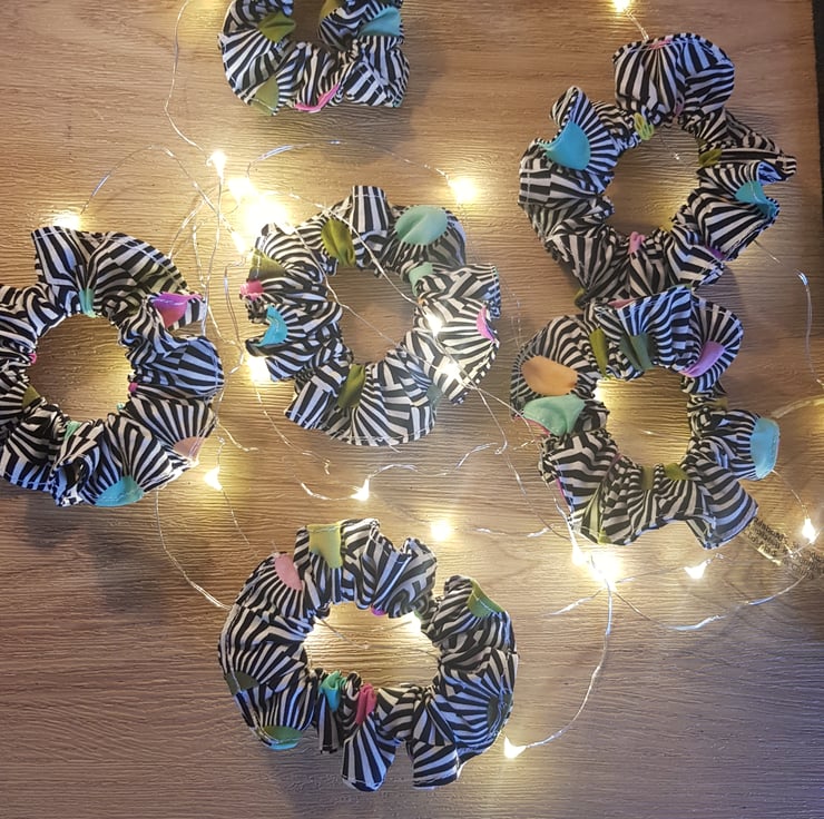 These are handmade cotton hair scrunchies in made from a black and whote pront with large poka dots on in a rainbo colours by tula pink.
