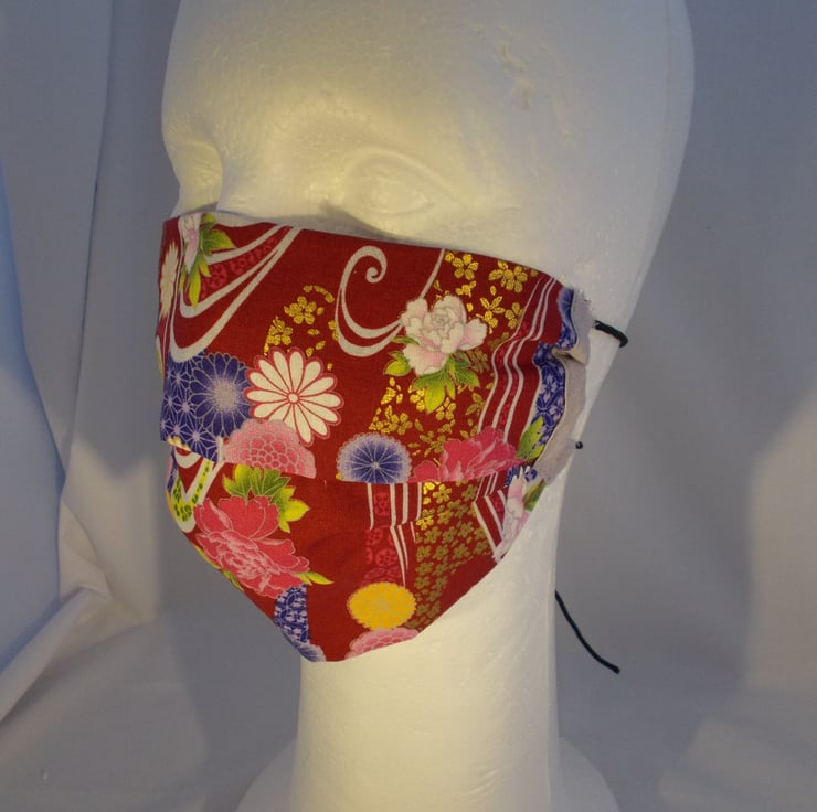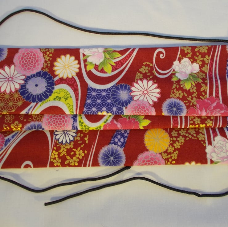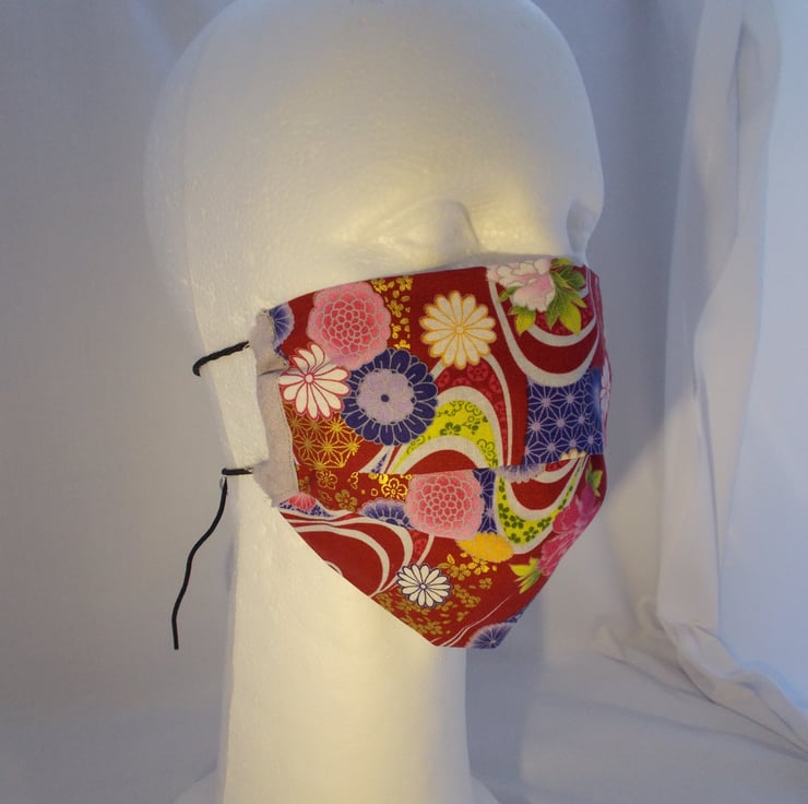 A washable double fabric face covering with interior pocket. It is made from 100% cotton and comes with pre threaded cotton ties or elastic ties for you to adjust to size, please make your choice in the selection option.