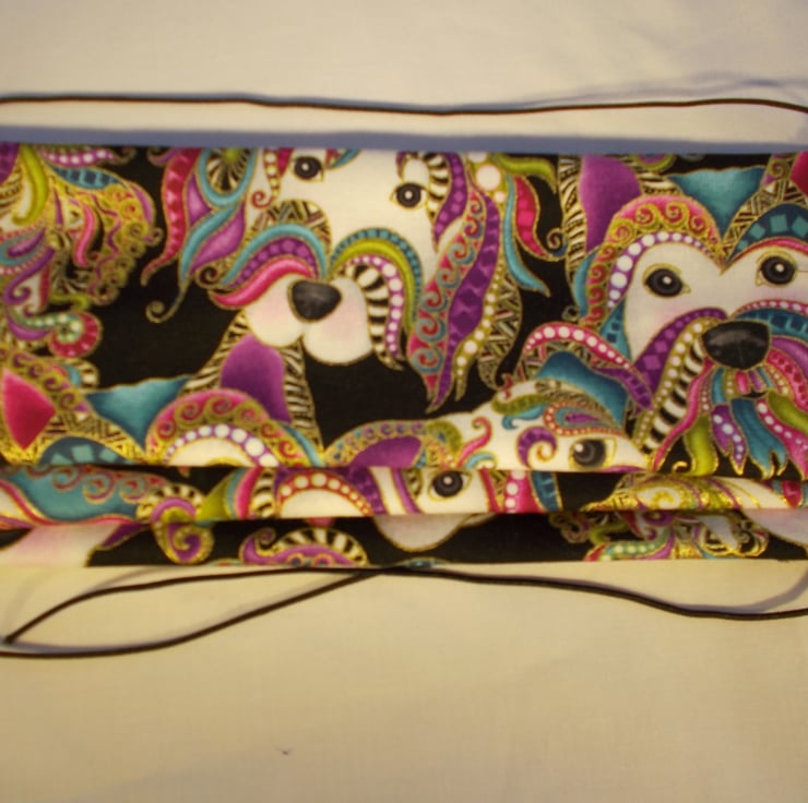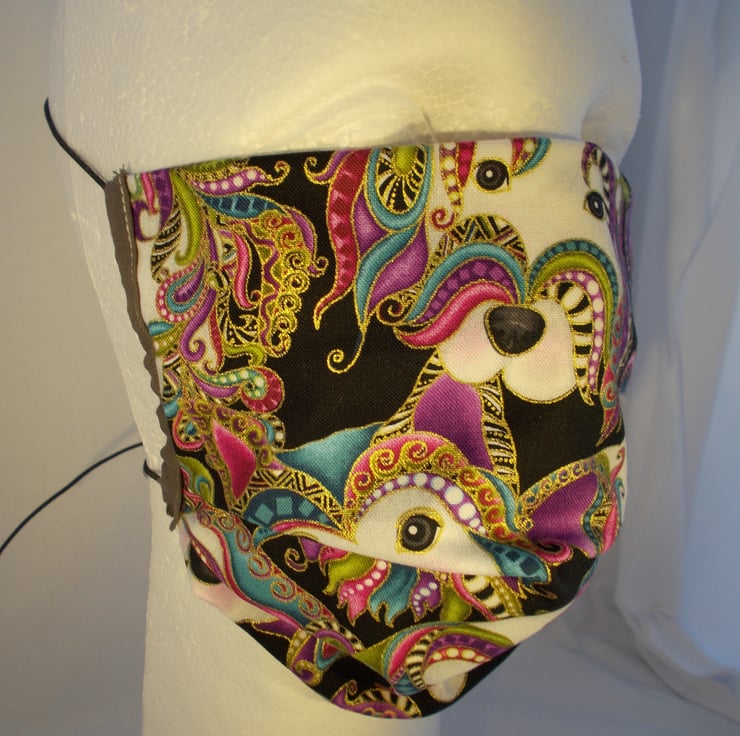 A washable double fabric face covering with interior pocket. It is made from 100% cotton and comes with pre threaded cotton ties or elastic ties for you to adjust to size, please make your choice in the selection option.