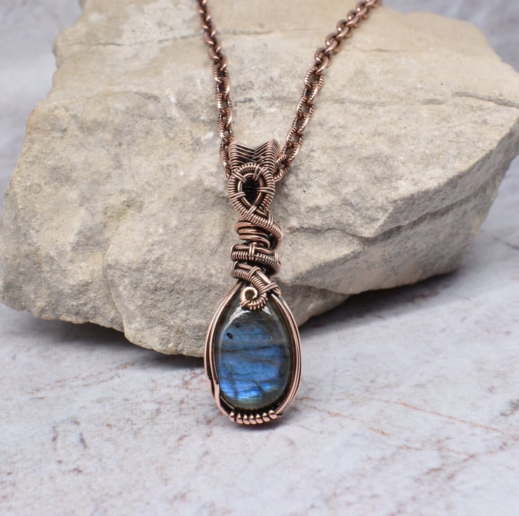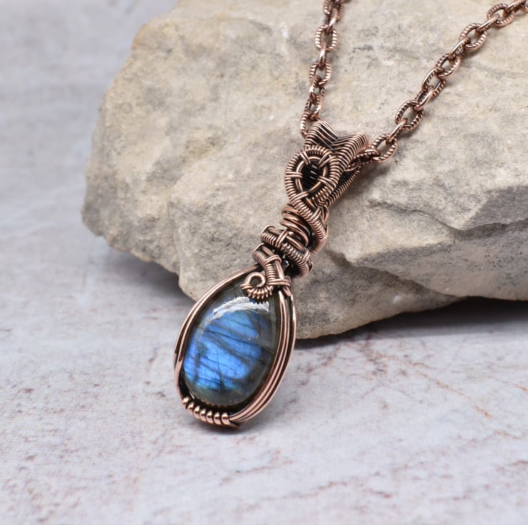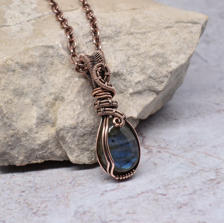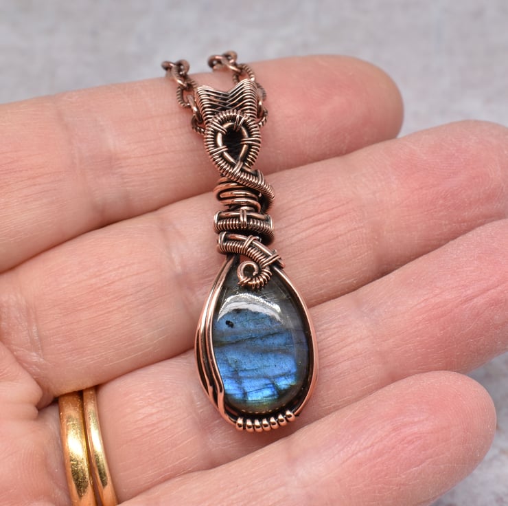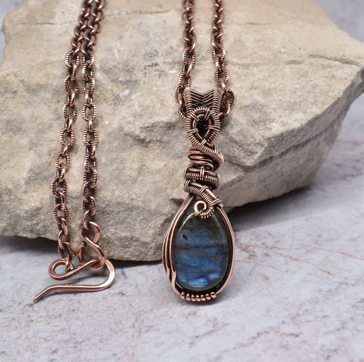 A pretty blue labradorite cabochon I have wire wrapped and woven in solid copper wire to make this dainty pendant which hangs from a copper chain with handmade clasp.