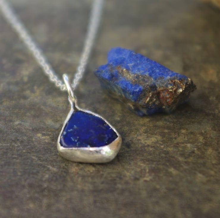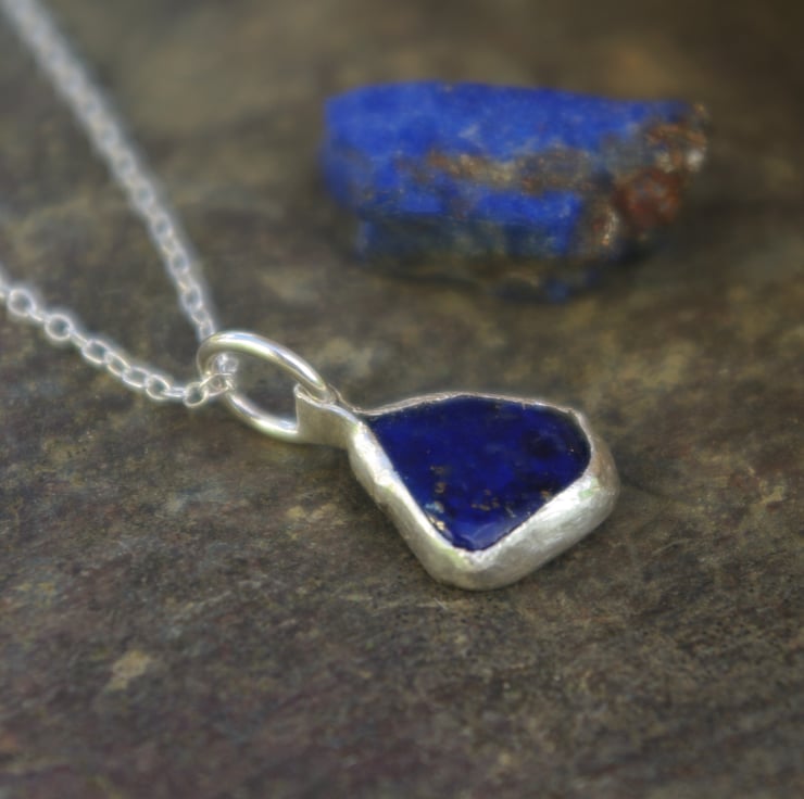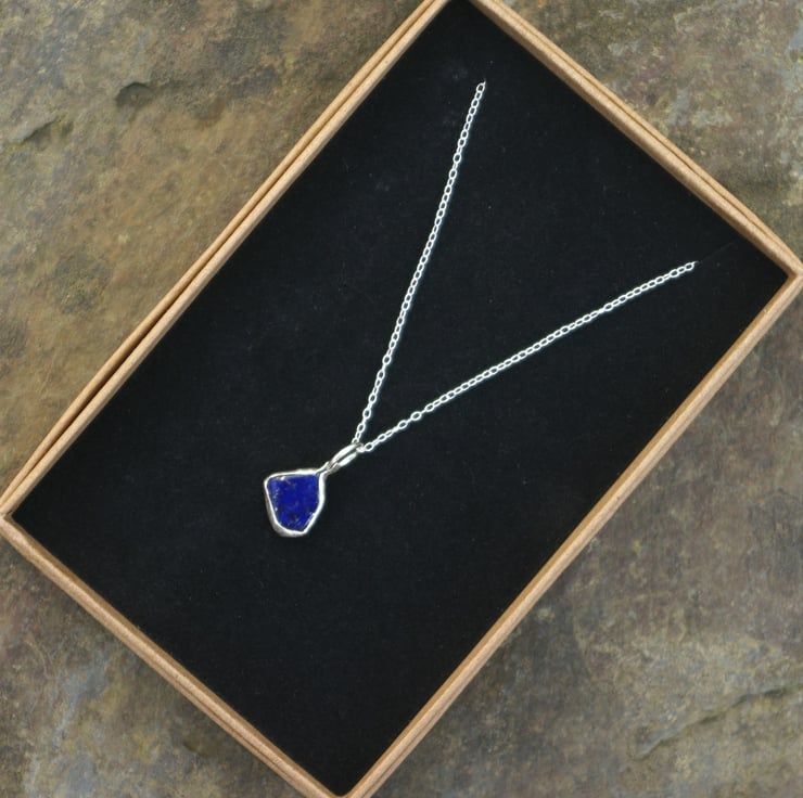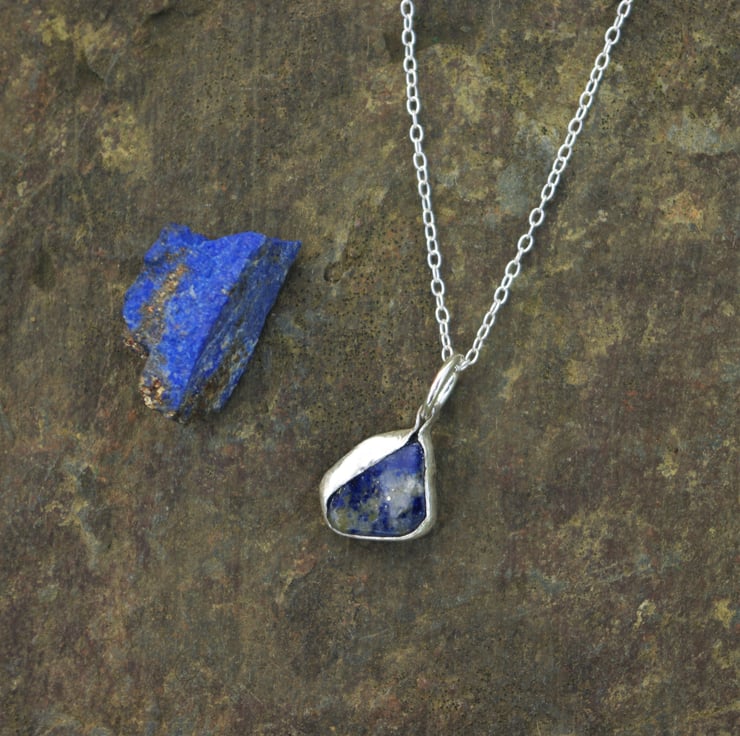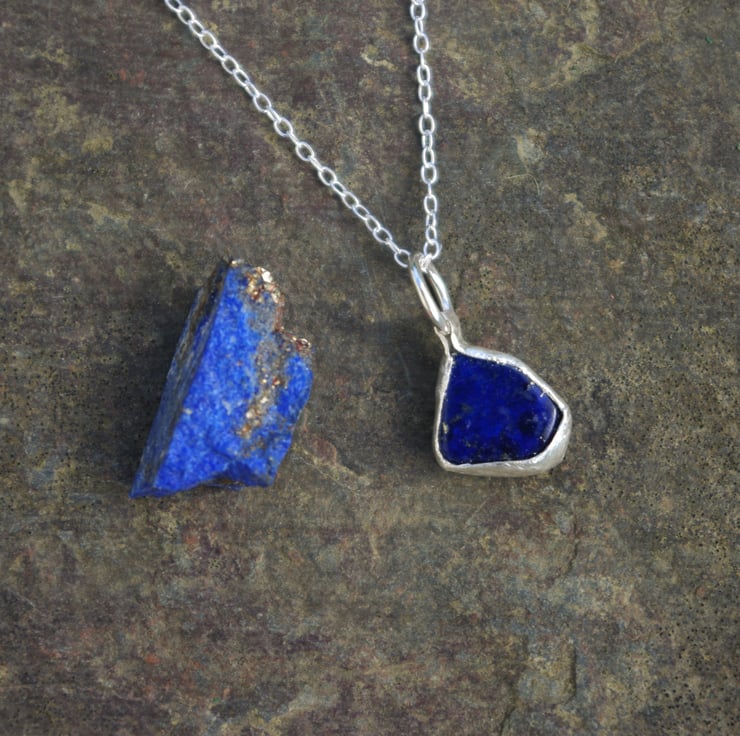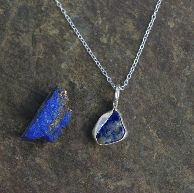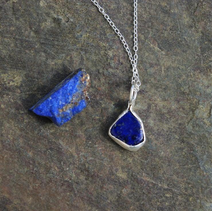 A piece of gorgeous Lapis Lazuli , which I have wrapped in fine silver to make a setting and hung from an 18 inch /45cm sterling silver fine trace chain. It has a lovely dark blue colour and hints of pyrites.-bits of gold colour. The other side has lighter colours in it (photo 3) and could be worn that way round too.