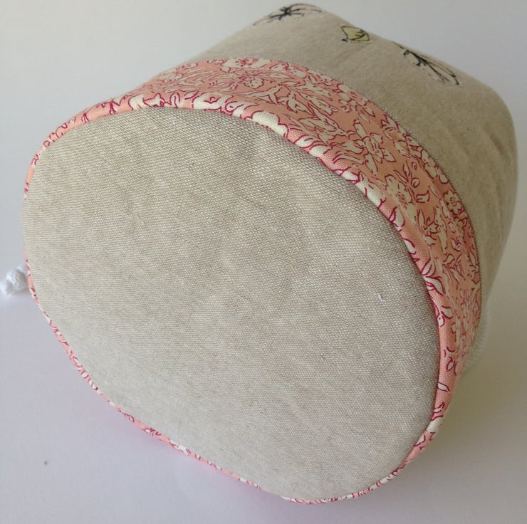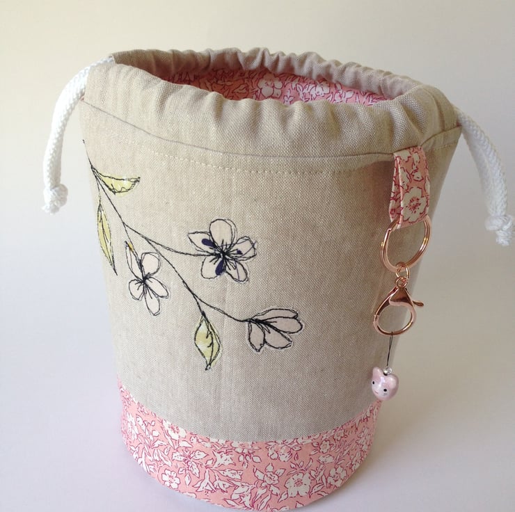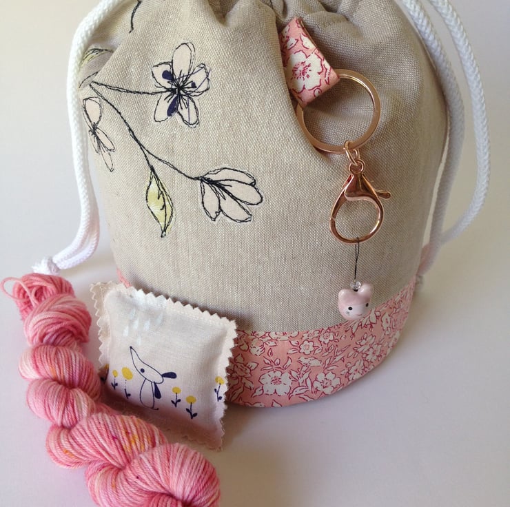 Hand crafted round based adorable little Draw string bag to keep your hand knitted socks or other small projects in.