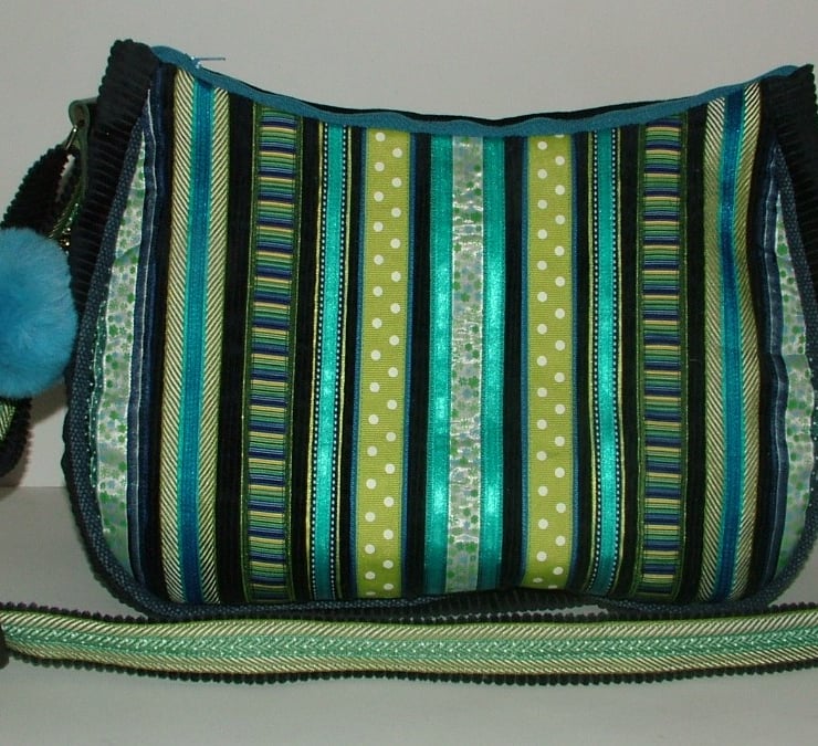 The back is a Navy corduroy which has been overlaid with blue, green and aqua ribbons in different patterns and textures