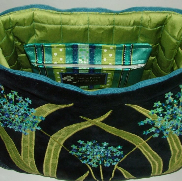 The bag fastens with a dusky blue zip which reveals inside a green satin quilted lining which has contrasting blue sticking and stripy inside pocket with makers label.