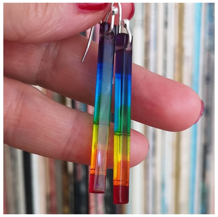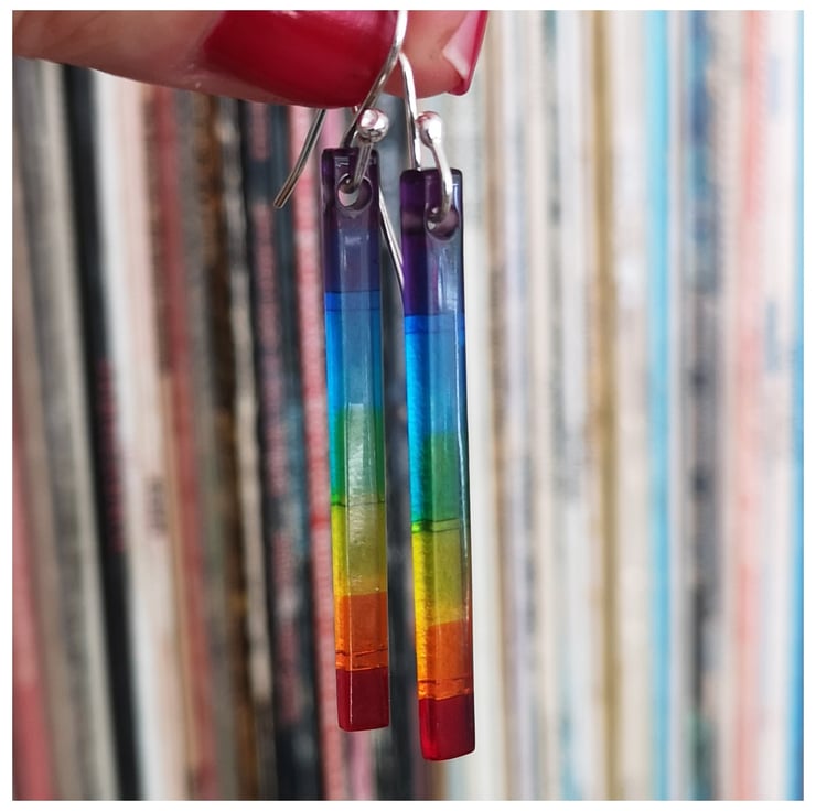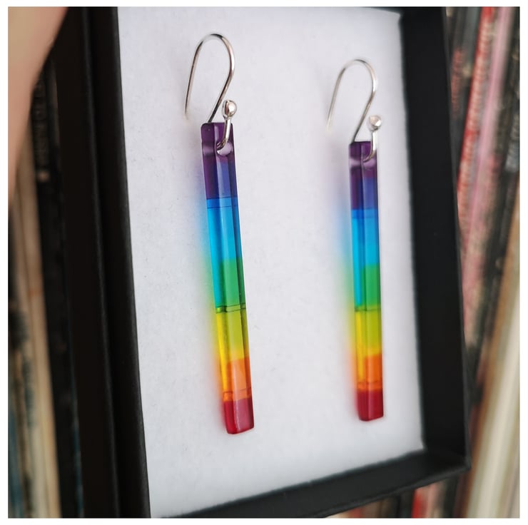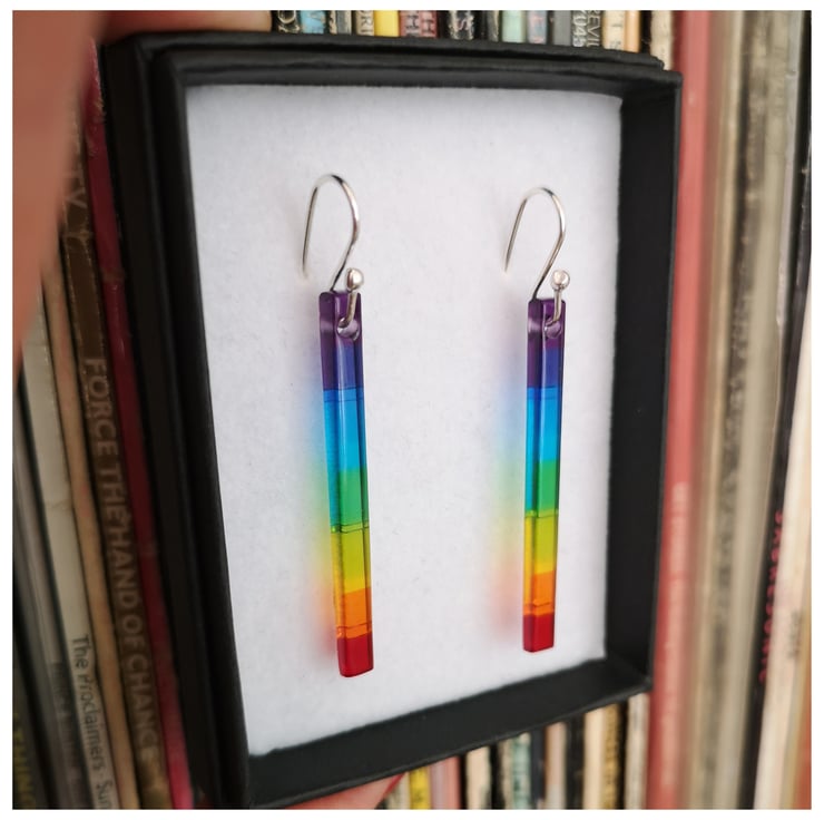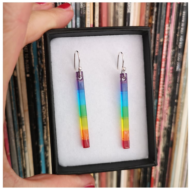 This listing is for a dainty pair of glass rainbow earrings on sterling silver ear hooks. Both the glass and sterling silver hooks have been made by myself. I call them my 'match stick' range as they are square and thin. They are comfortable in the ear as they are lightweight and still pack a colourful rainbow punch.