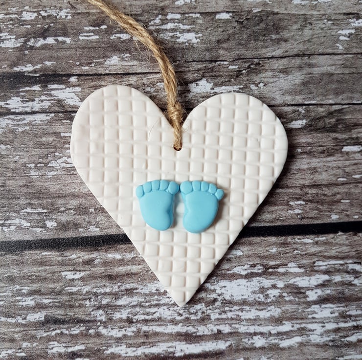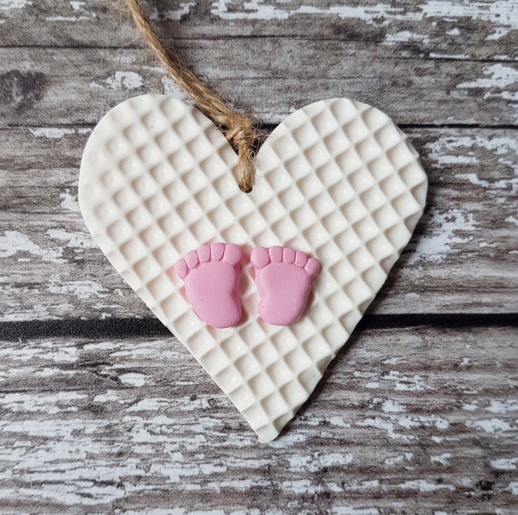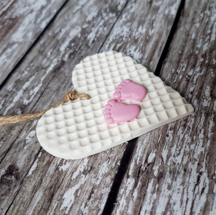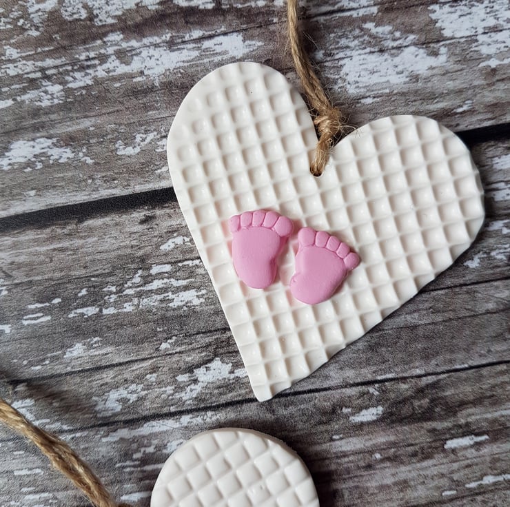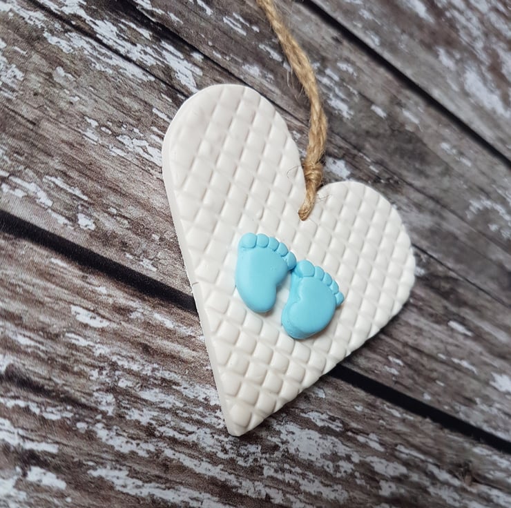 These cute little heart shaped decorations are made of white polymer clay, with a texture added to the heart, and a pair of tiny cute baby feet in 3d placed onto the top! Such a beautiful gift for a new baby arrival, and perfect as a letterbox sized gift too!