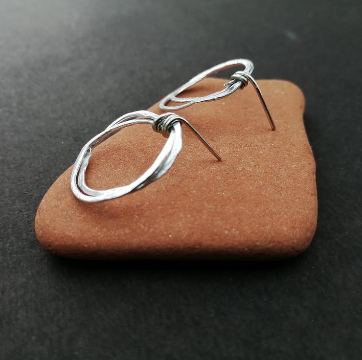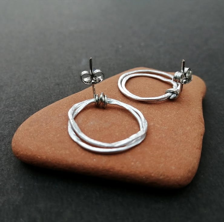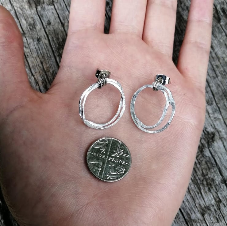 These contemporary earrings are made up of two overlapping hammered silver circles that are then wire wrapped to make stud earrings. They shine beautifully in the sun because the hammered, textured silver reflects the light.
