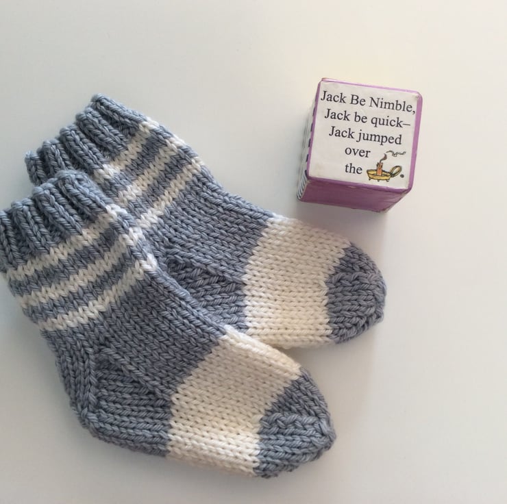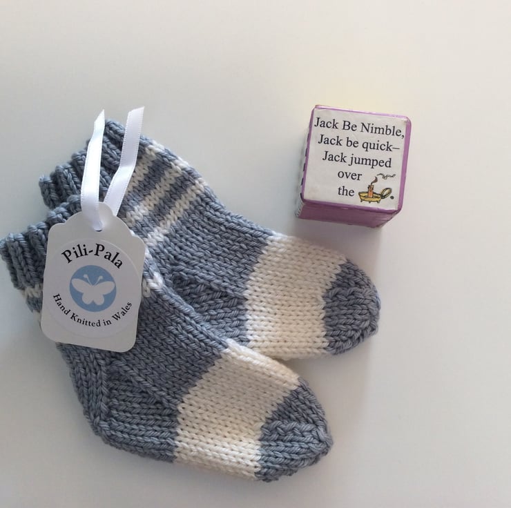 These soft little socks are hand knitted by me. They are knitted in a cashmere blend wool that is soft for babies feet but can also be washed at 30 degrees. They are for age 3-6 months.