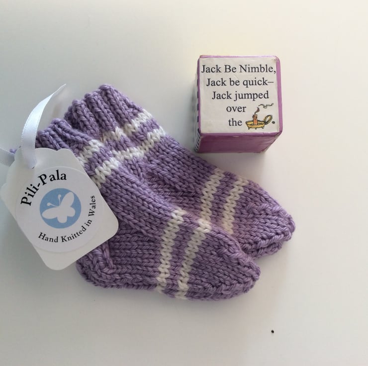 These soft little socks are hand knitted by me. They are knitted in a cashmere blend wool that is soft for babies feet but can also be machine washed at 30 degrees. They are for age 0-3 months.