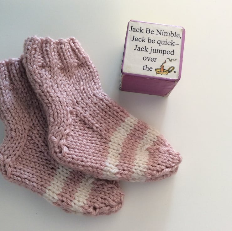 These soft little socks are hand knitted by me. They are knitted in a cashmere blend wool that is soft for babies feet but can also be machine washed at 30 degrees. They are for age 0-3 months.