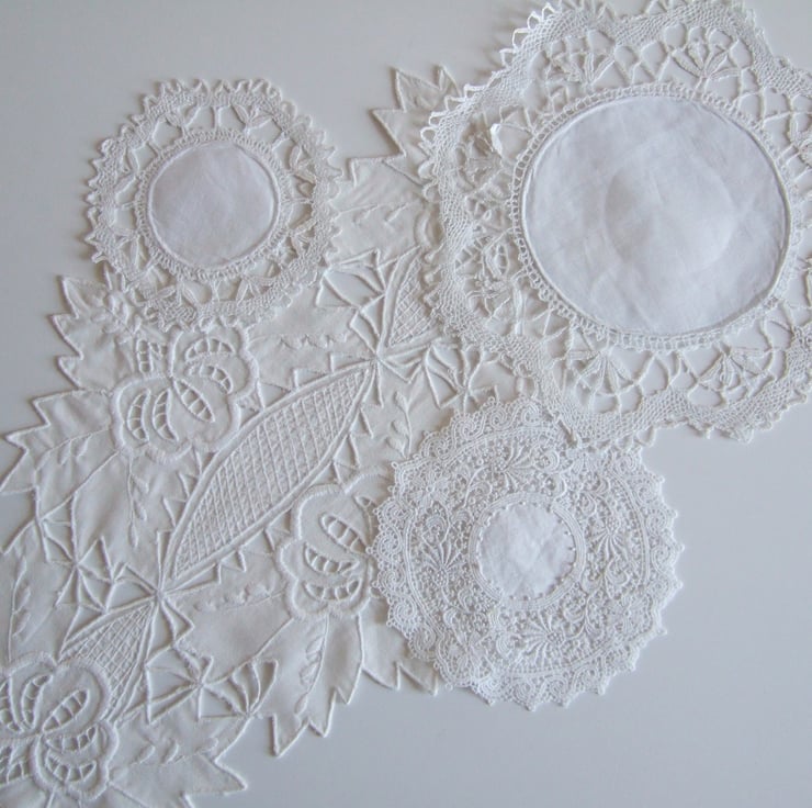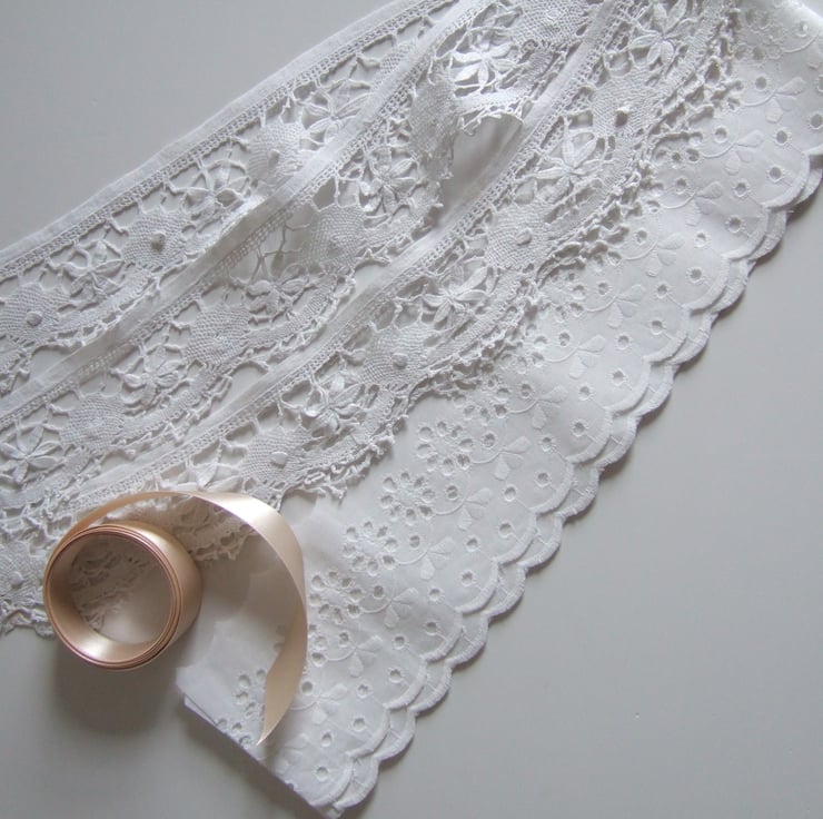 Vintage white cotton lace salvaged from an old tablecloth, and a piece of wide, white broderie anglaise approx 1.5 metres.