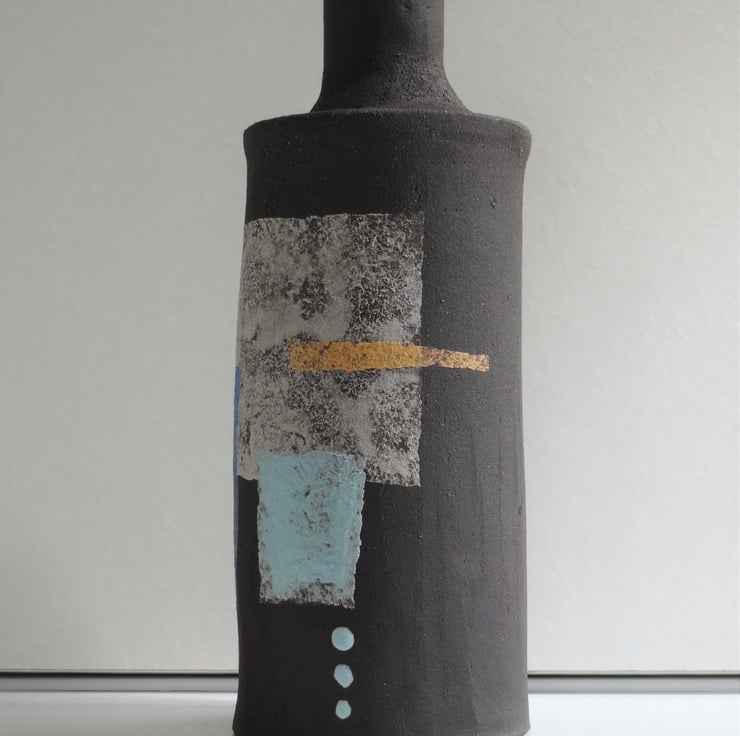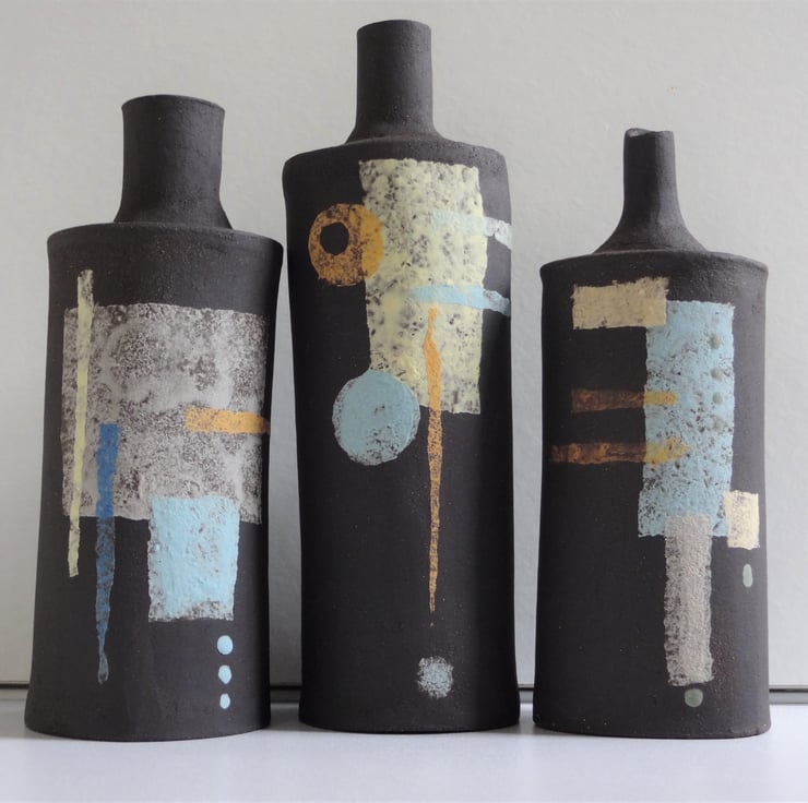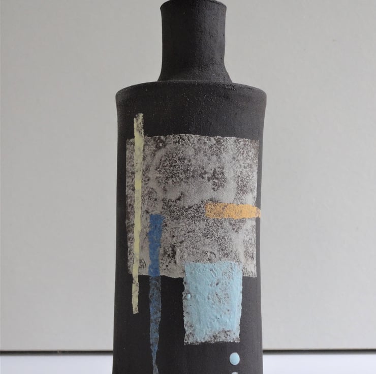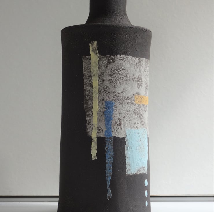 Becky (on the left in the group of three) is handmade in black stoneware clay and is part of the Simple Earth Collection. The outside is unglazed, showing the black clay just as it is. I decorate using soft pastel shades which show up well on the dark unglazed background, using ceramic slip applied with a natural sponge, masking off areas with torn paper to form the stripes and rectangles, while dots are formed with a brush. Becky features soft grey, pale blue, lemon, dark blue and yellow in the colour scheme. Becky is 14.5 cms high approx.and on the base is my potter’s mark of a swallow in flight. Becky looks good on her own as a focal point, or displaying dried flowers or grasses, or as part of a group from the Simple Earth Collection - one of the images shows Becky with some friends!