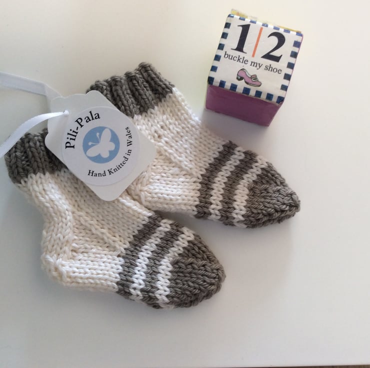 These soft little socks are hand knitted by me. They are knitted in a cashmere blend wool that is soft for babies feet but can also be machine washed at 30 degrees. They are for age 0-3 months.