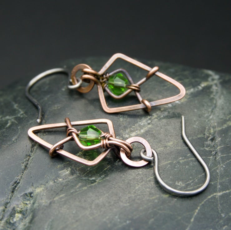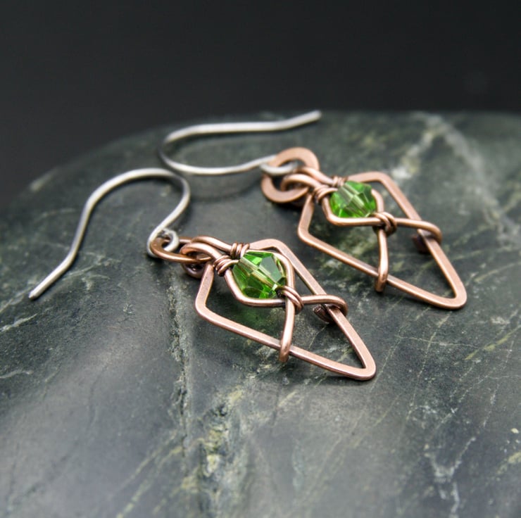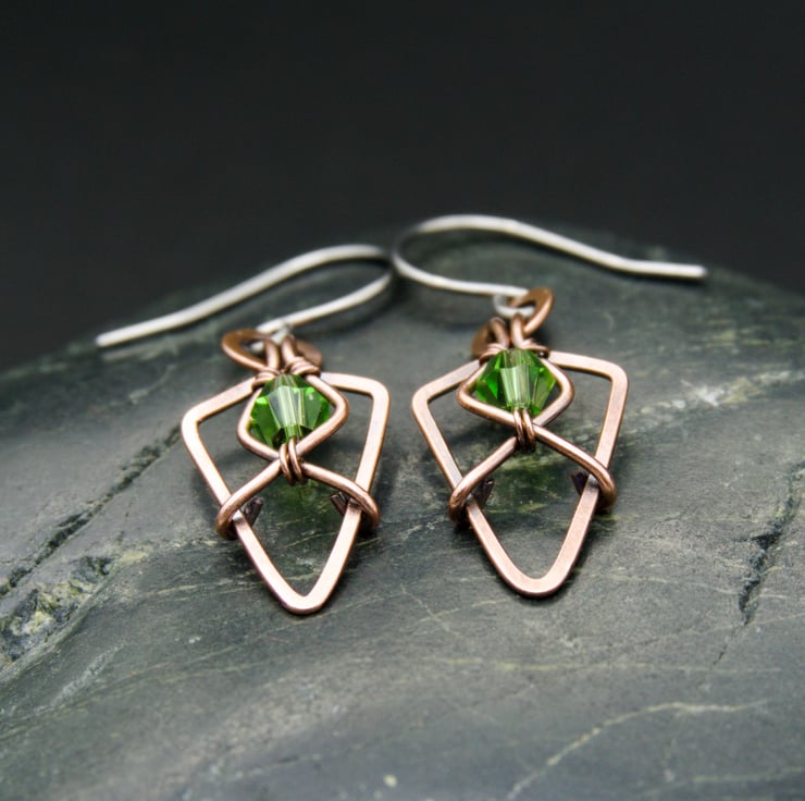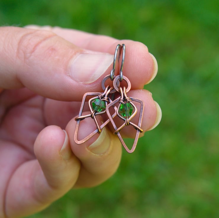 These gorgeous earrings have been entirely handmade from lengths of copper wire. I've created arrowhead shapes, which I've then hammered flat. The tails create a square frame on the front of the arrowhead, within which I have woven a 4mm bicone bead. The beads are faceted light green glass - a beautiful combination with the antiqued copper.